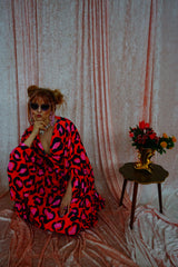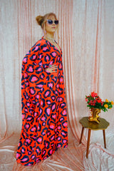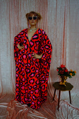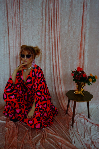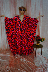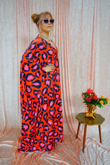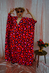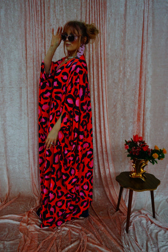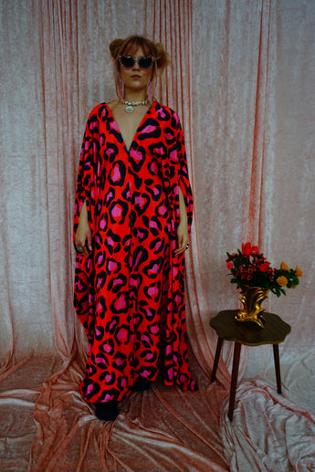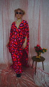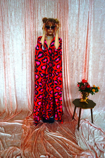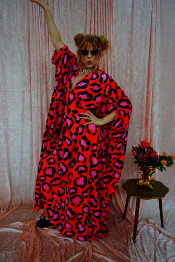 Cheetah Print Red and Pink Opulent Velvet V-Neck Kaftan Gown. *Please note the print will not sit in the same place for each dress and the positioning of the pattern will differ from dress to dress.
