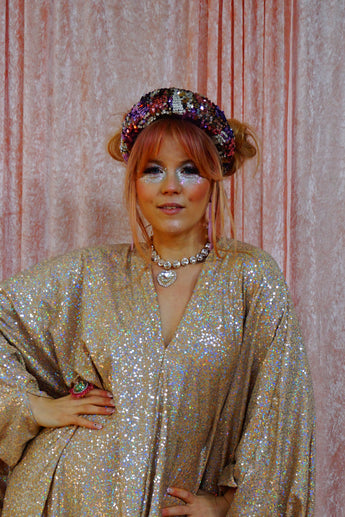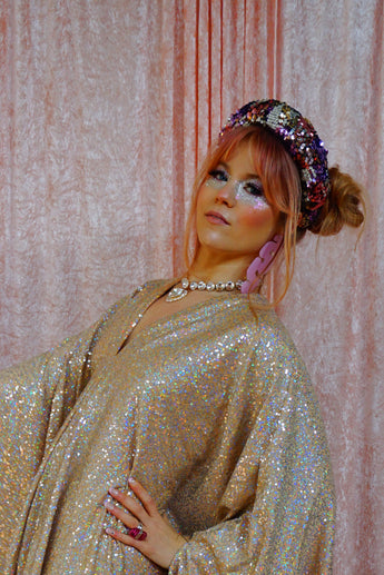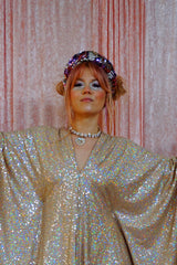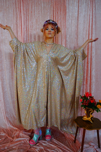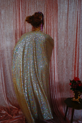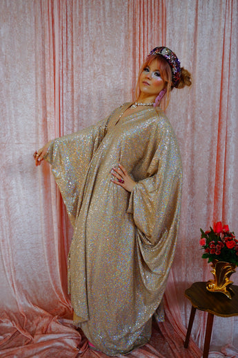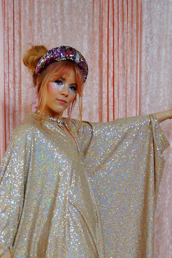 Champagne Shimmer Sequinned V-Neck Maxi Kaftan Gown. A champagne stretch lycra base smothered with silver holographic sequins. Worn with our hidden ribbons tied to cinch in at the waist (can also be worn loose). The centre of the kaftan will always be the shortest length, as our kaftans are designed to be longer at the sides than at the front to create a draped, bell sleeved effect.