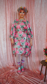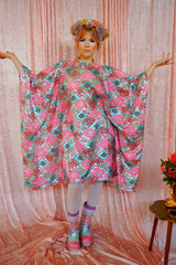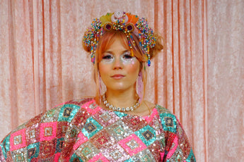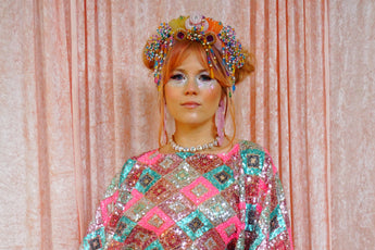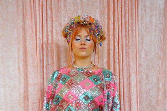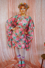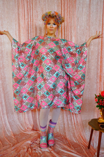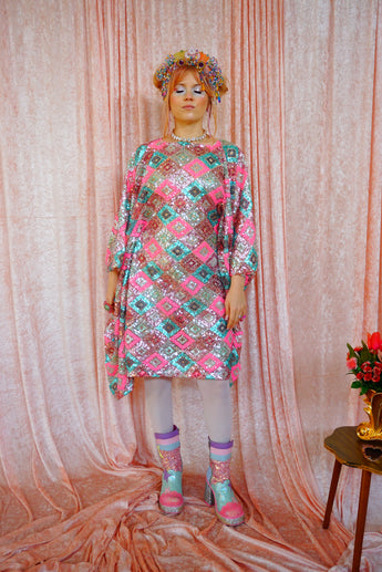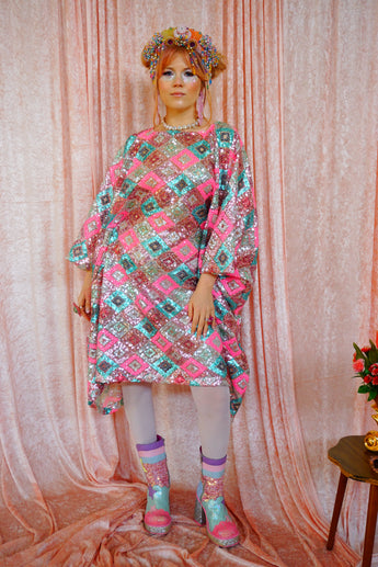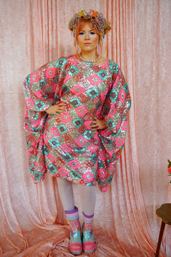 Pink and Blue Sequinned Geometric Diamond Print Kaftan Mini on a mesh base with a small amount of stretch.. Worn with our hidden ribbons tied to cinch in at the waist (can also be worn loose).
