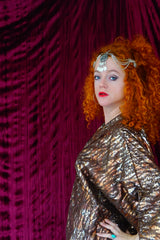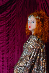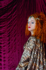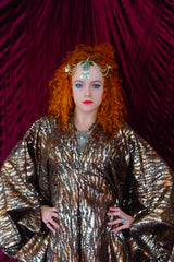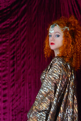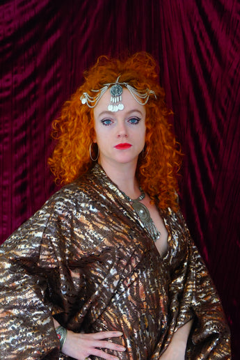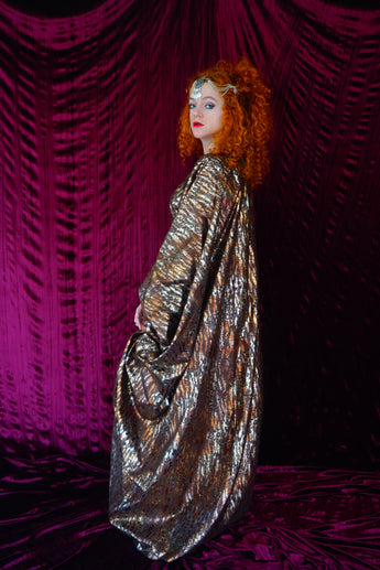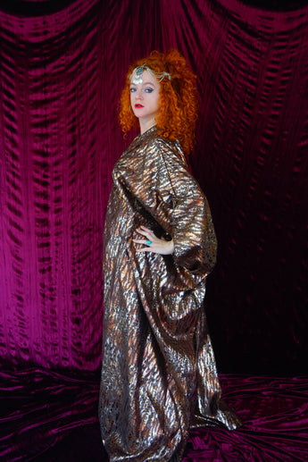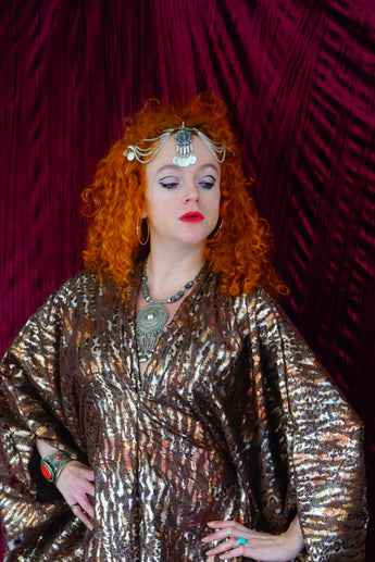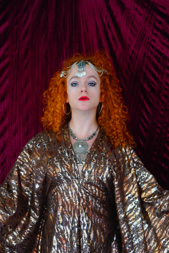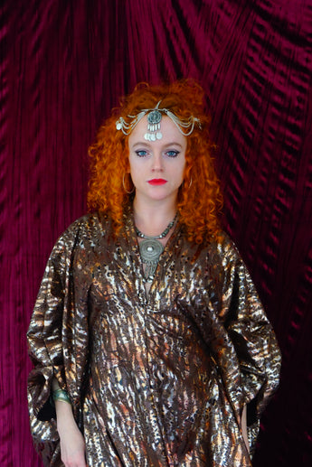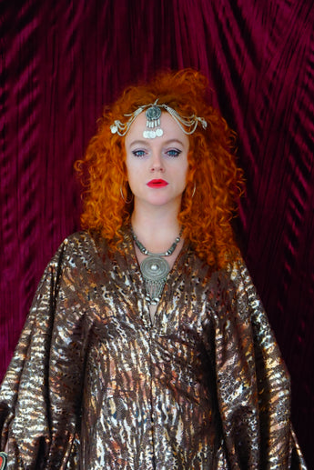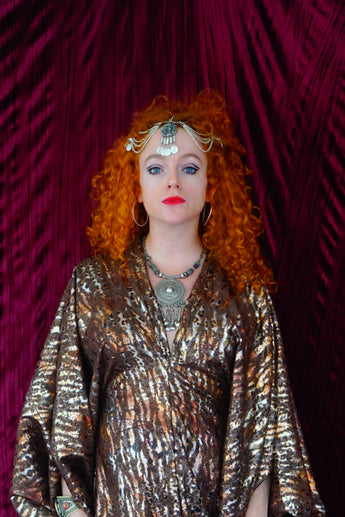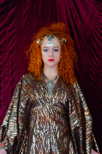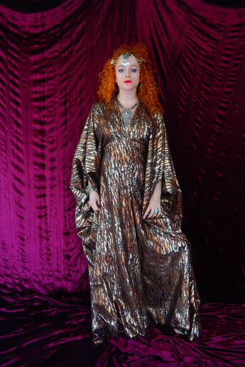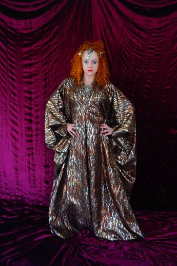 Our kaftan dresses are uniquely fitted with hidden velvet ribbons on the inside meaning you can wear them two ways - 1) Free, loose and baggy, and 2) with the ribbons tied at the waist to pull the dress in and frame your figure.