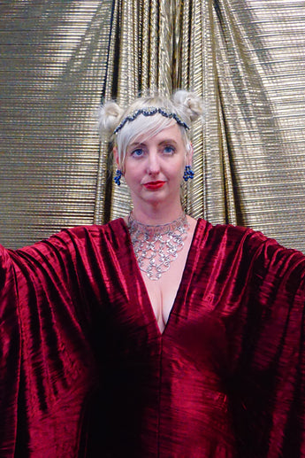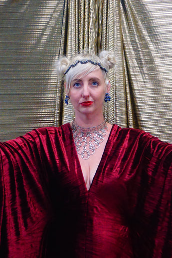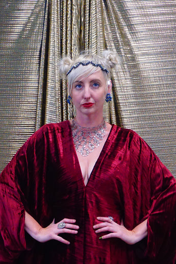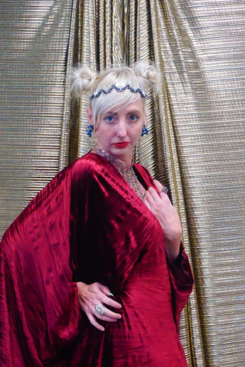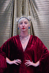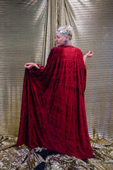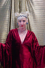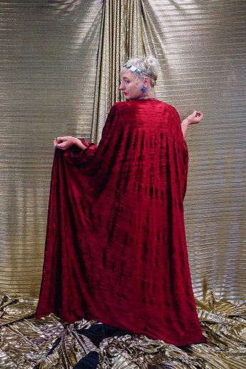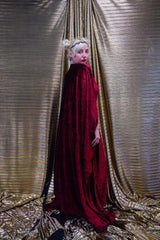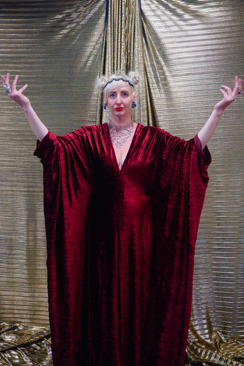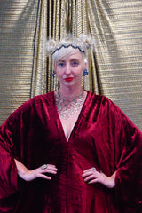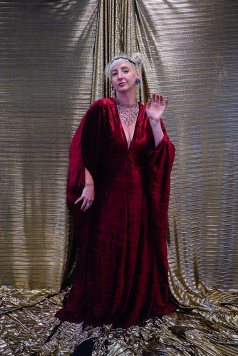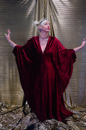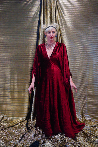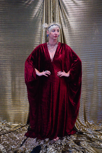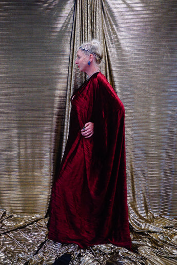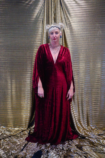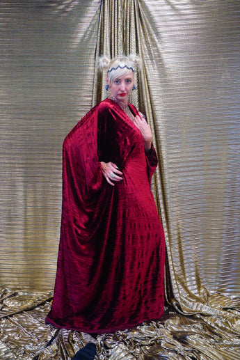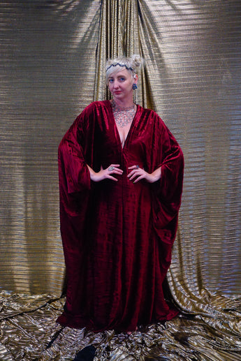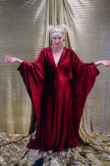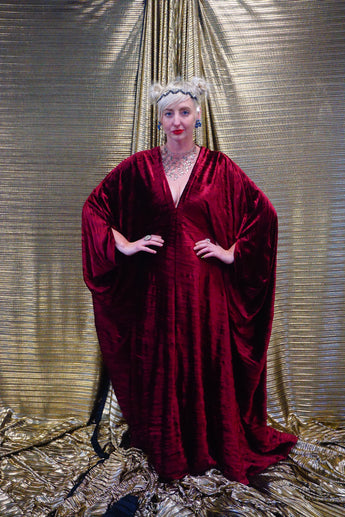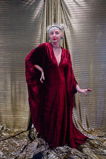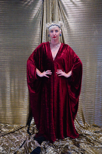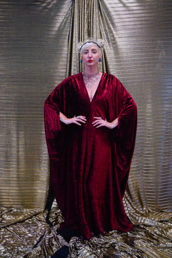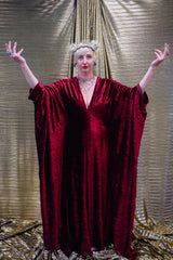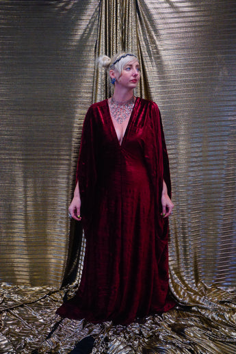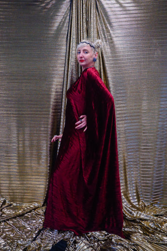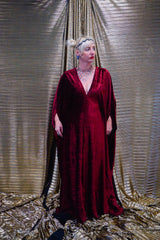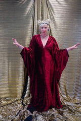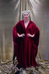 Divine and luxurious medium weight velour fabric in claret red with a crinkle effect throughout. Handmade in our bespoke V-neck kaftan gown style with a twisted hem feature to work with the fabric.