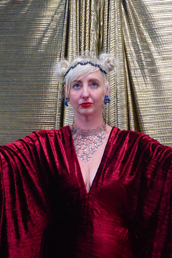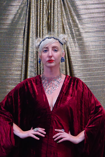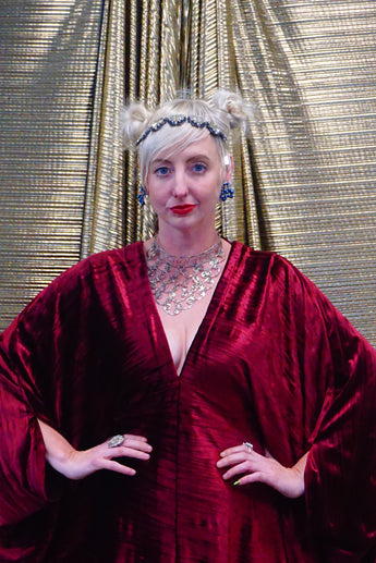 Our kaftan dresses are uniquely fitted with hidden velvet ribbons on the inside meaning you can wear them two ways - 1) Free, loose and baggy, and 2) with the ribbons tied at the waist to pull the dress in and frame your figure.