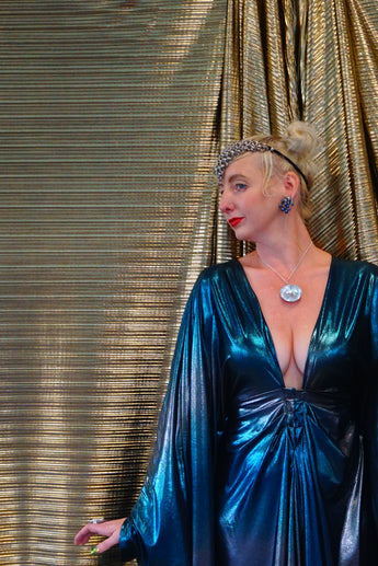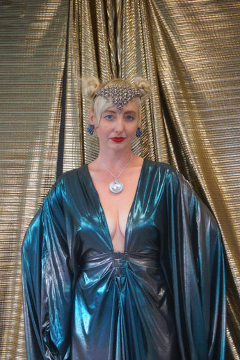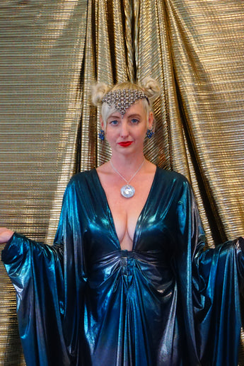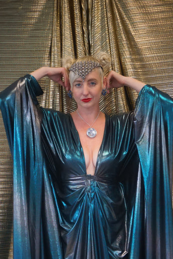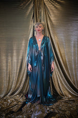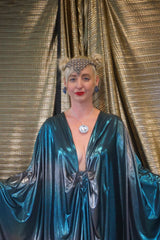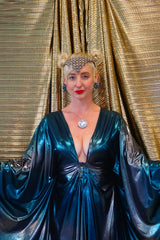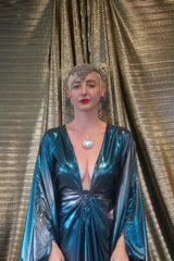 DIVINE liquid wet look fabric kaftan design with a very deep plunge neckline with hand stitched ruching at the centrepiece and split all the way up to the central focal point (can be made with no split, please just add this to your order notes). Extra hook and eye on the Plunge to close higher.