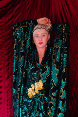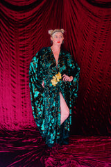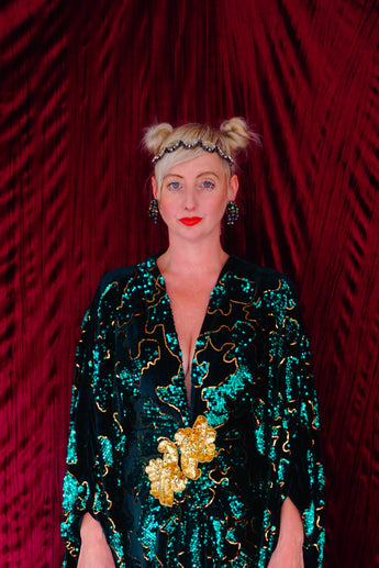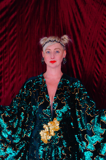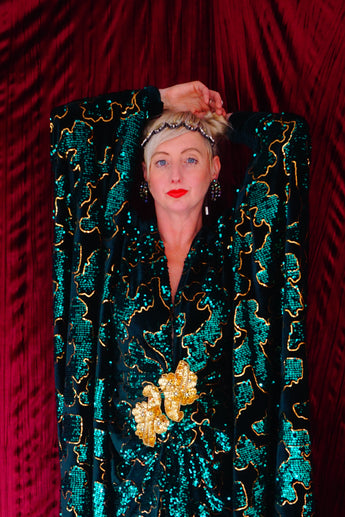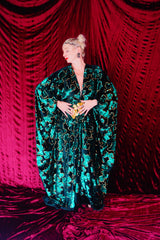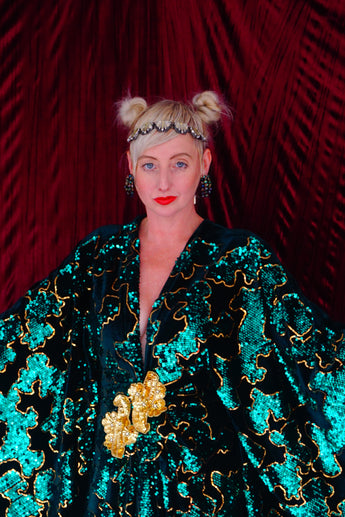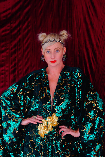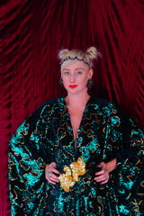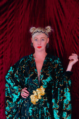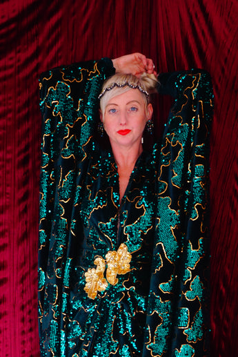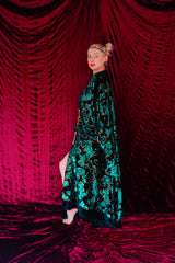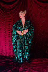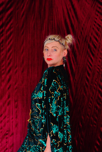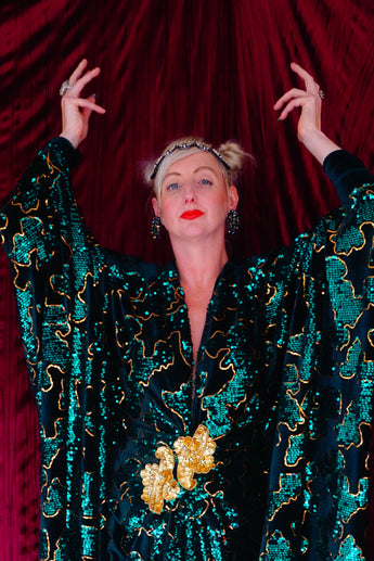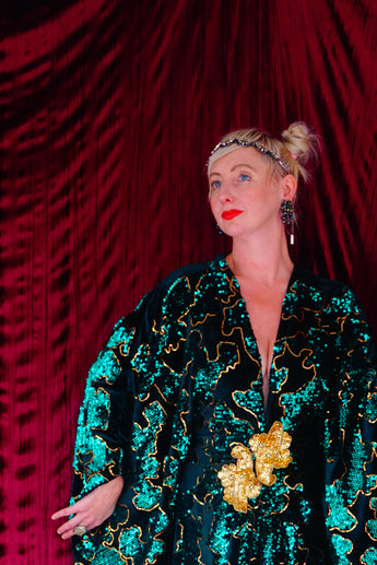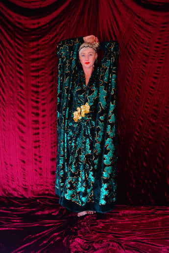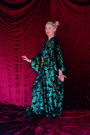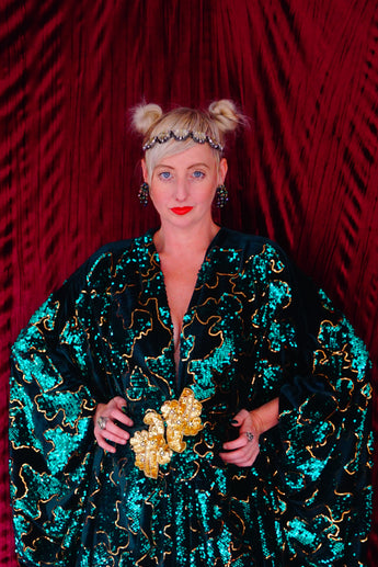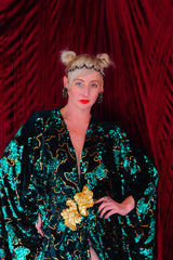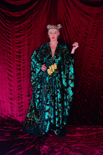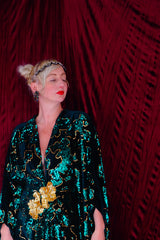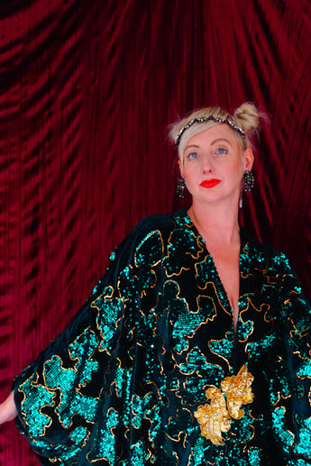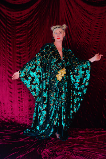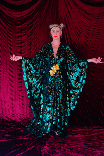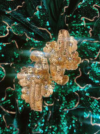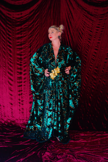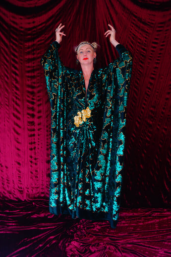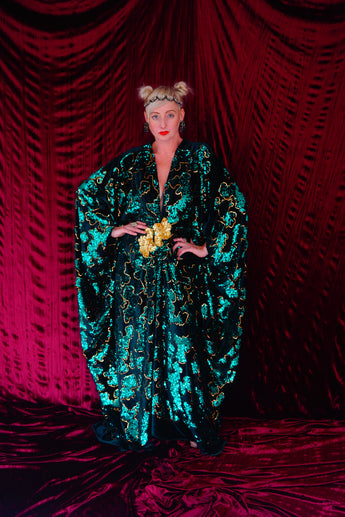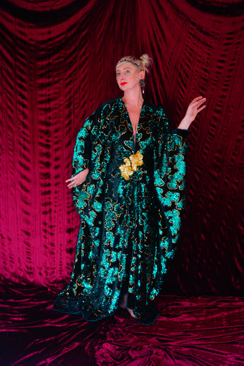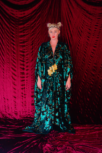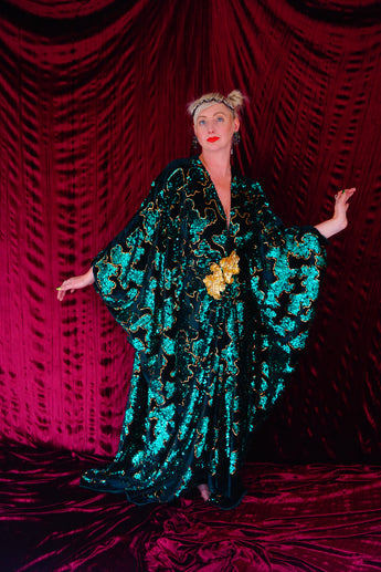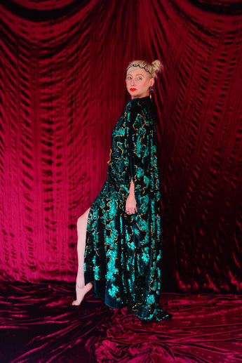 Divine and luxurious low plunge (with additional hidden hook and eye) batwing Kaftan gown. Made with a medium weight soft velvet fabric in a vibrant emerald green with incredible gold and green sequin patterns sparkling throughout and central hand stitched gold sequin embellished centrepiece and full front split (can be sewn up at request - please add to order notes)