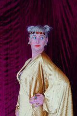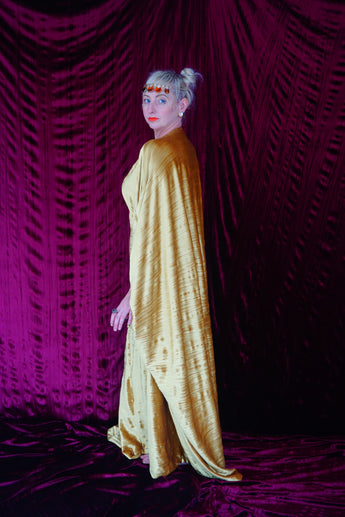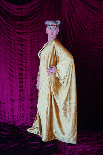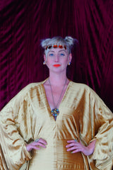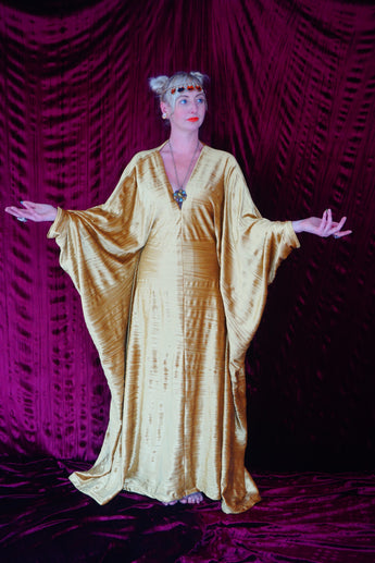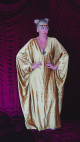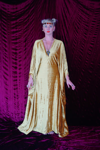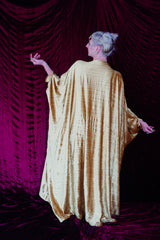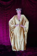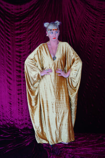 Divine and luxurious medium weight velour fabric in yellow Gold with a crinkle effect throughout. Handmade in our bespoke V-neck kaftan gown style with a twisted hem feature to work with the fabric.