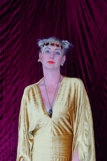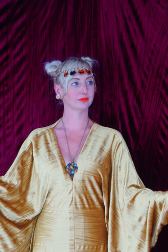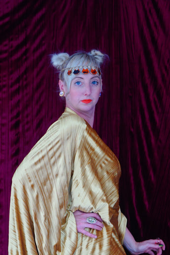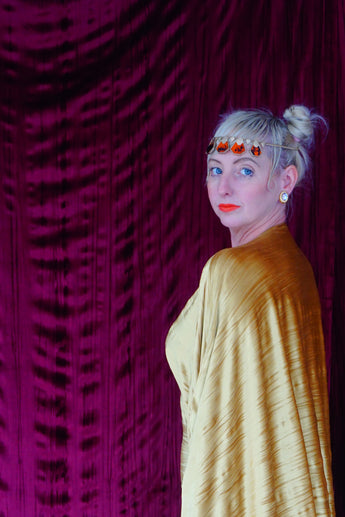 Our kaftan dresses are uniquely fitted with hidden velvet ribbons on the inside meaning you can wear them two ways - 1) Free, loose and baggy, and 2) with the ribbons tied at the waist to pull the dress in and frame your figure.