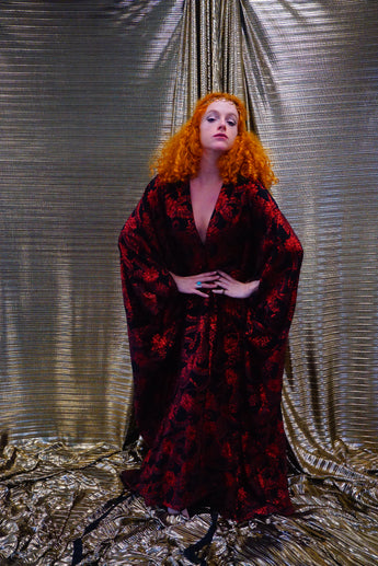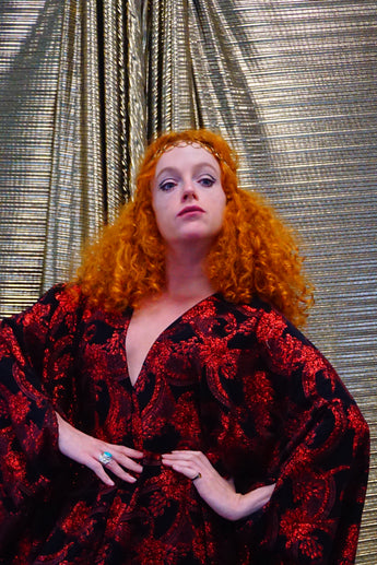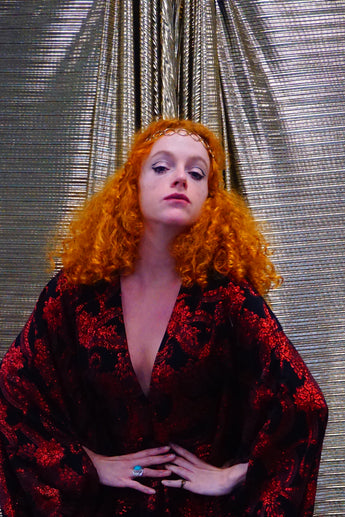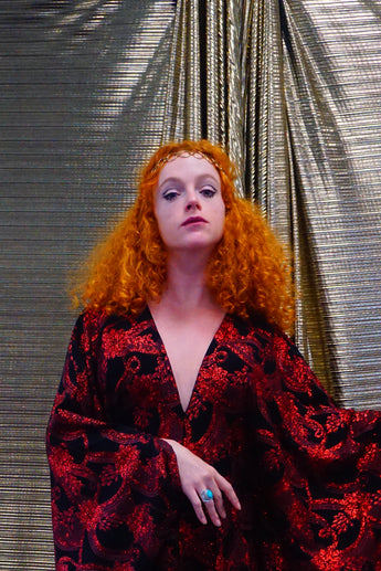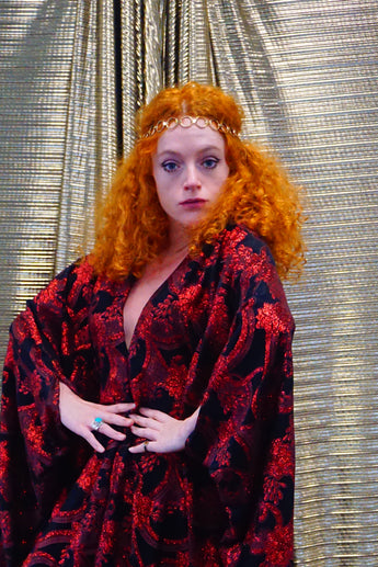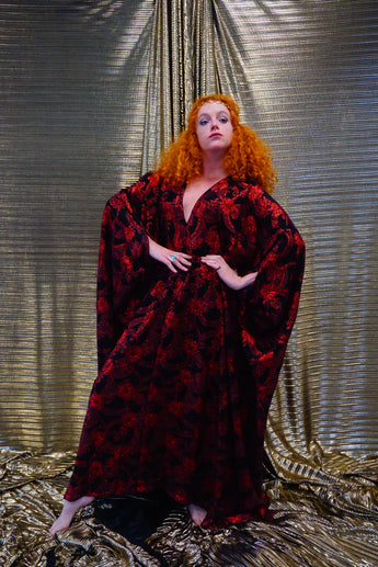 Our kaftan dresses are uniquely fitted with hidden velvet ribbons on the inside meaning you can wear them two ways - 1) Free, loose and baggy, and 2) with the ribbons tied at the waist to pull the dress in and frame your figure.