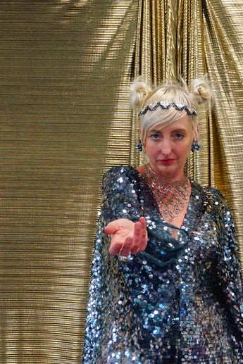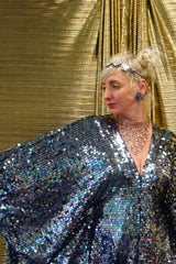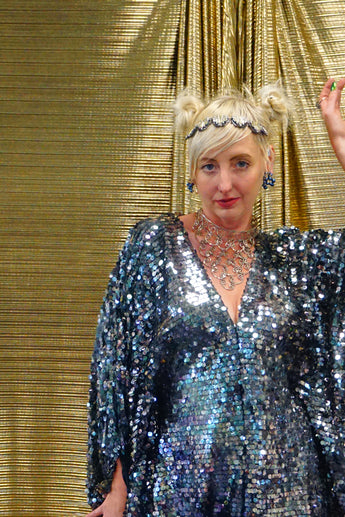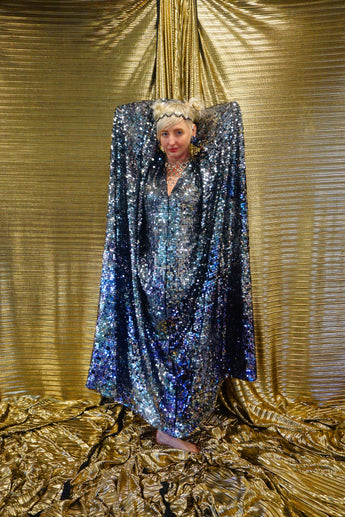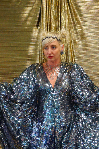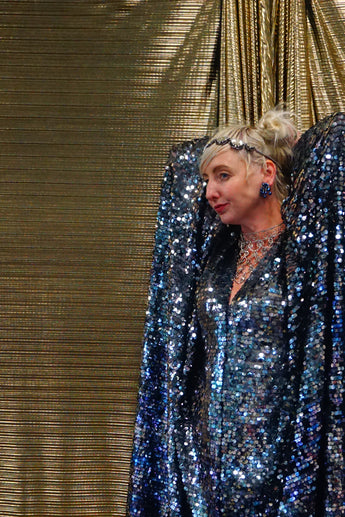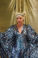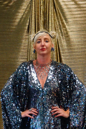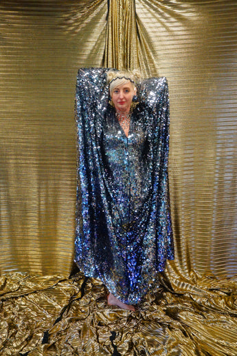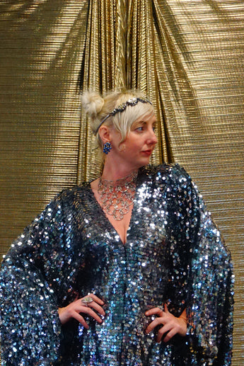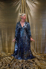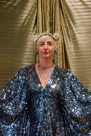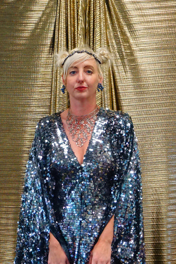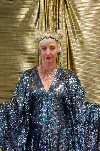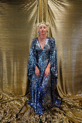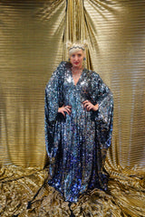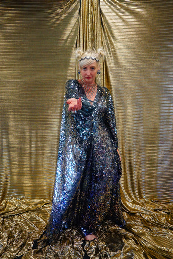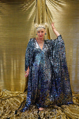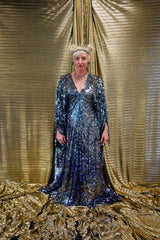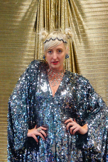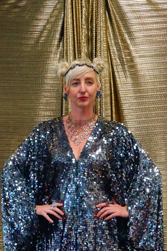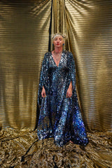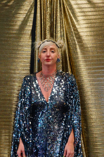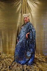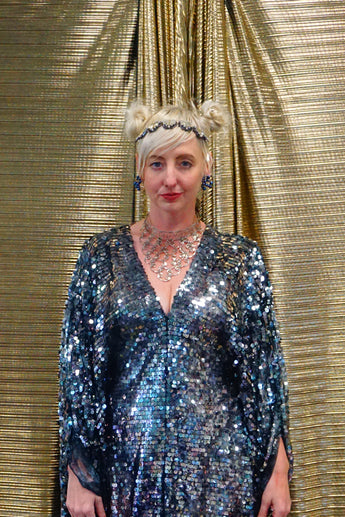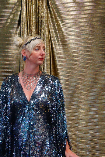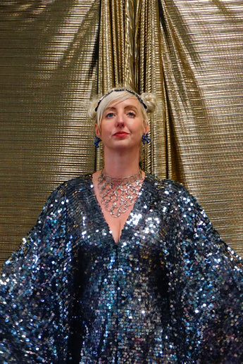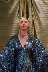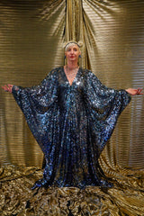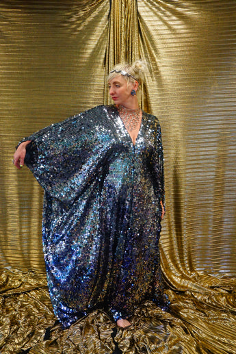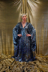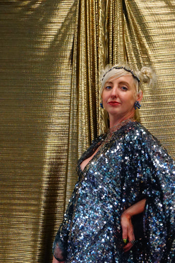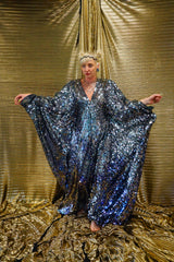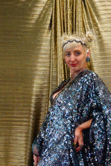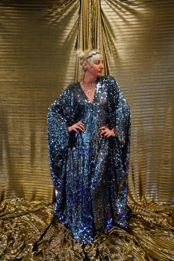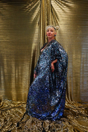 Our kaftan dresses are uniquely fitted with hidden velvet ribbons on the inside meaning you can wear them two ways - 1) Free, loose and baggy, and 2) with the ribbons tied at the waist to pull the dress in and frame your figure.