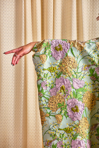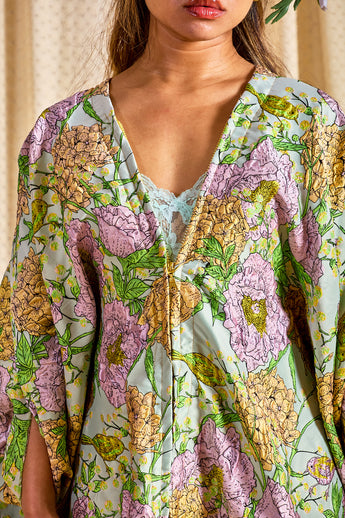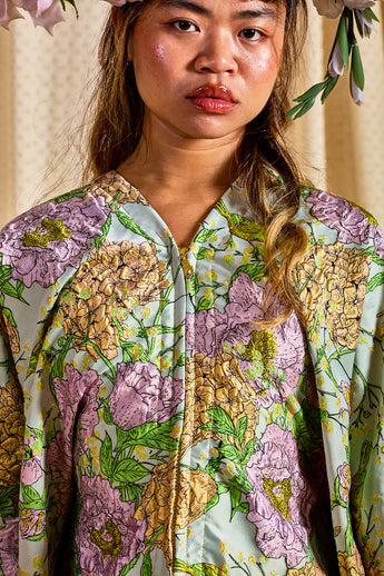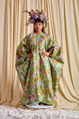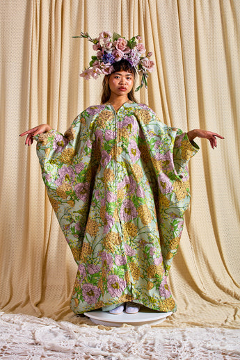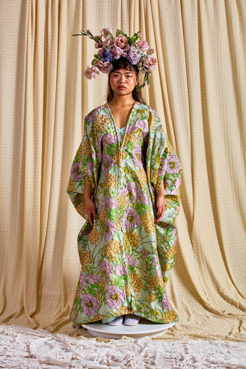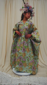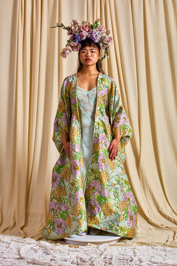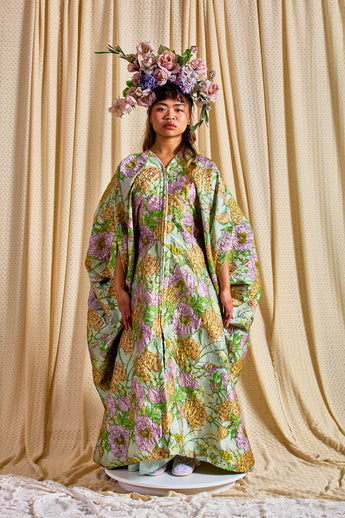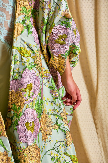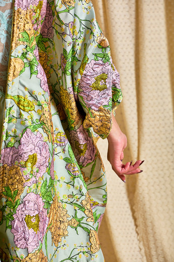 Mint Floral Brocade Zipped Kaftan Gown (so can be worn as an open Robe or zipped up with our ribbons tied as a kaftan gown). The fabric features an all-over print of blooming hydrangeas and birds in soft lilac, golden ochre, and fresh green tones. Medium - light weight
