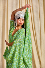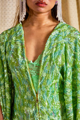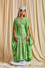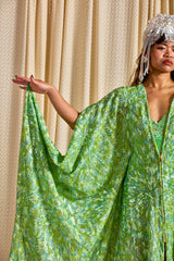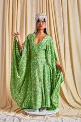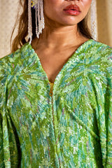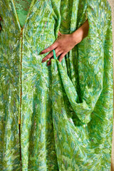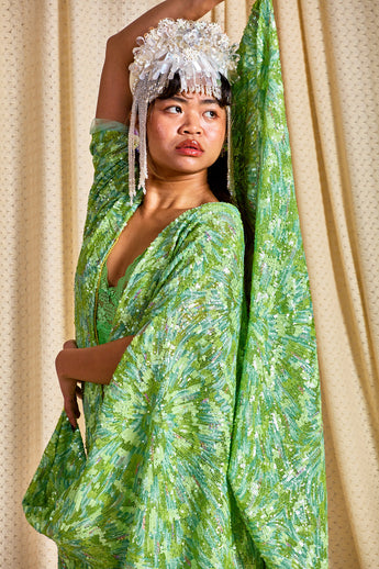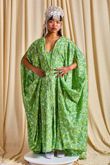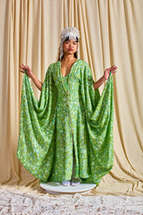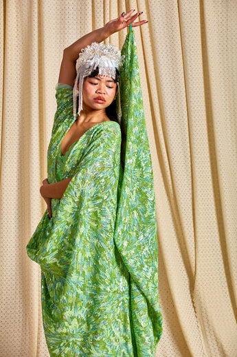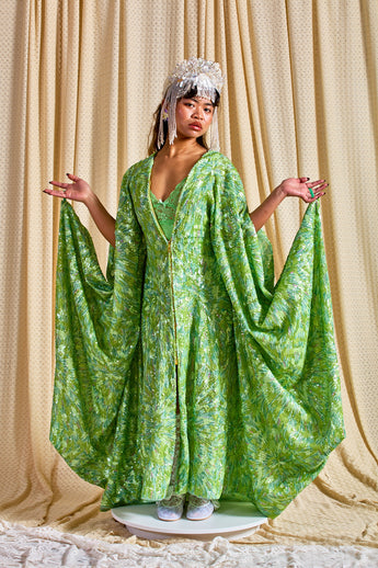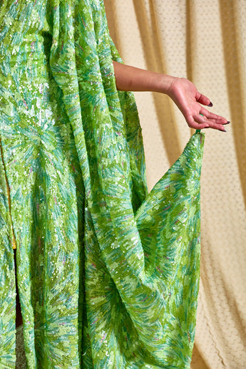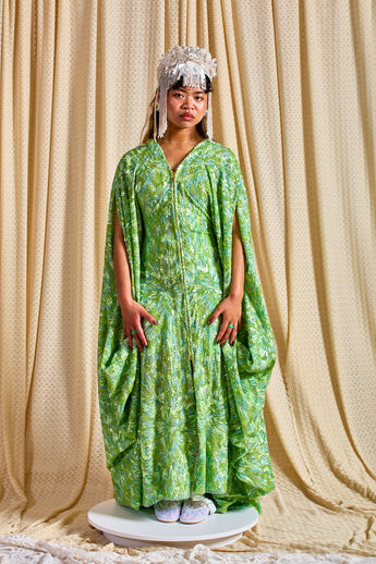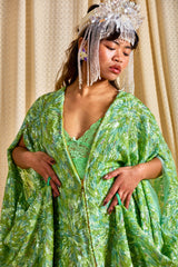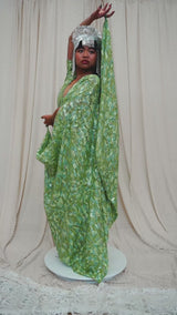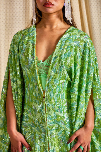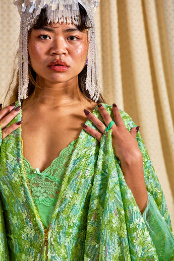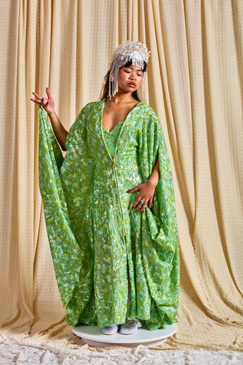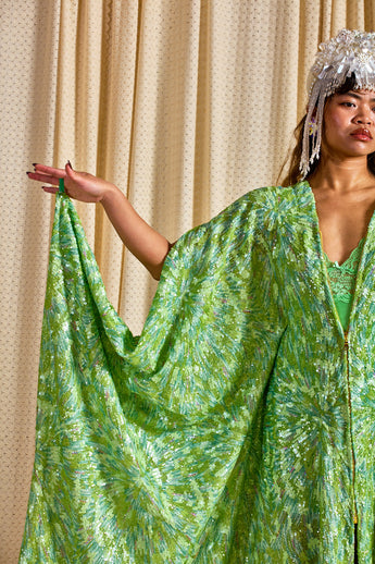 Shimmering Sequin Leaf Zipped Kaftan Gown (can be worn as an open robe or a kaftan gown with our hidden ribbons). The fabric shimmers with an all-over pattern resembling abstract foliage, made entirely from emerald, lime, and iridescent silver sequins. The style also incorporate butterfly loops to hold u the and tapered sides if desired.  Please note this is a heavy weight fabric and there is lots of it.