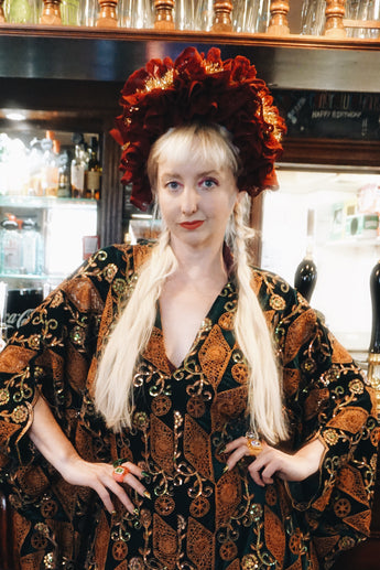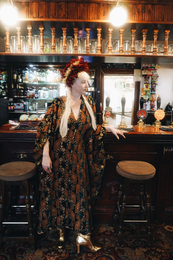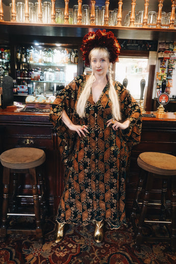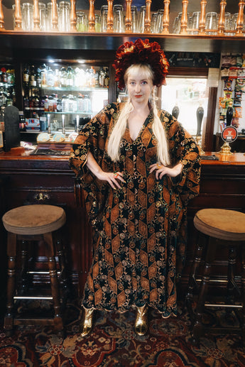 Our kaftan dresses are uniquely fitted with hidden velvet ribbons inside, meaning YOU decide how you'd like to wear them. Choose from -