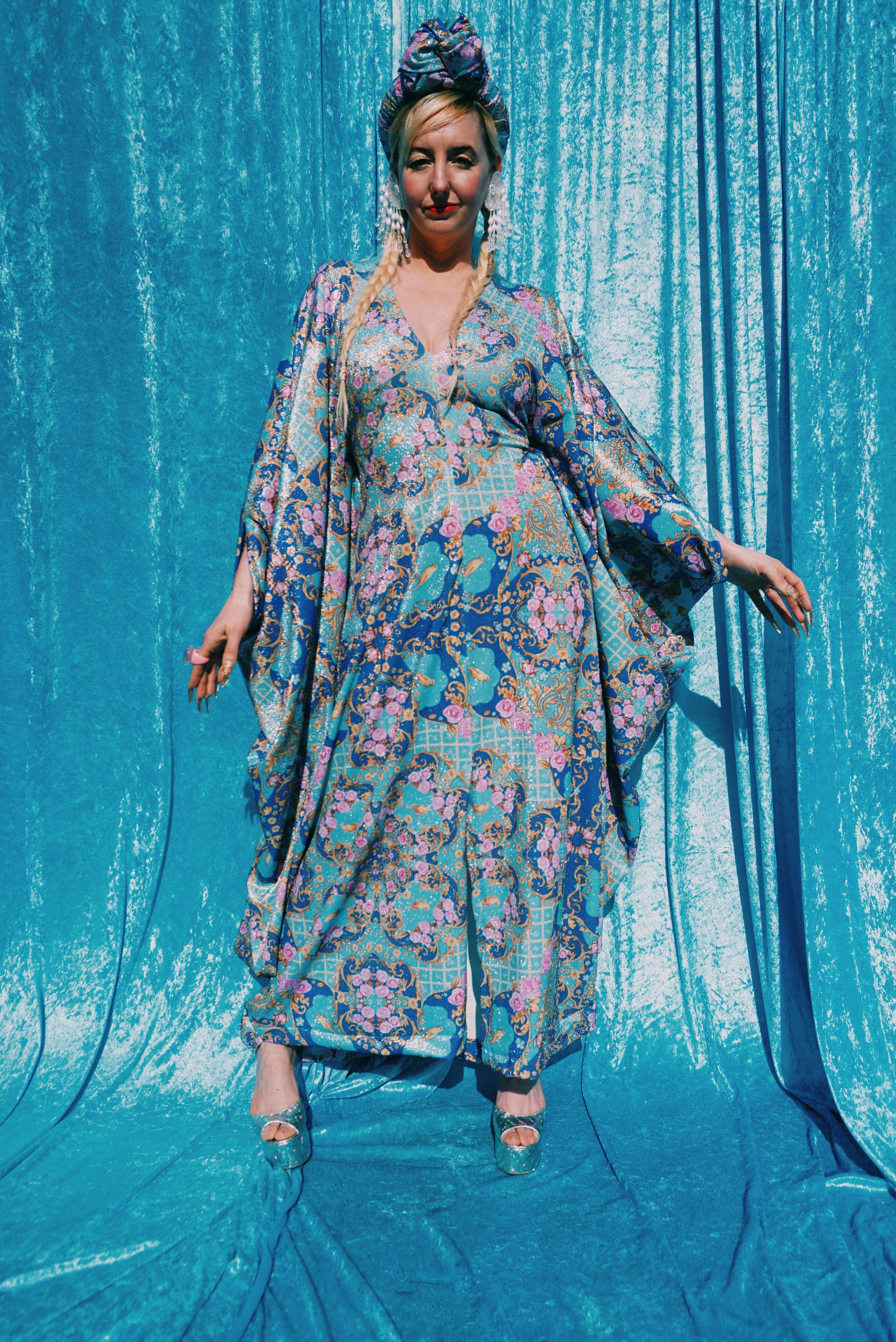 Model is 5ft 4 and and UK size 12 (Wearing 3 inch heels) and length of standard 138cm in a cascade style kaftan