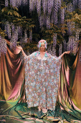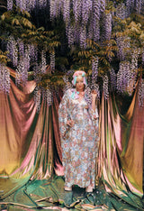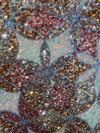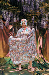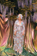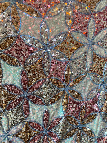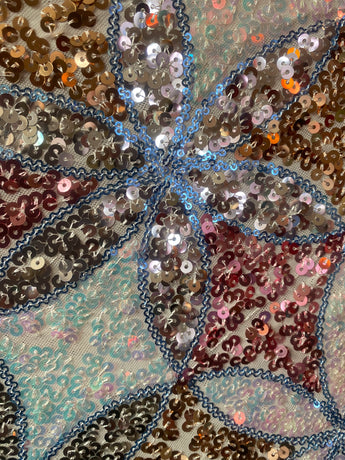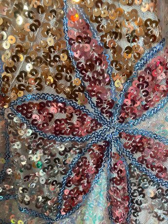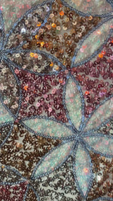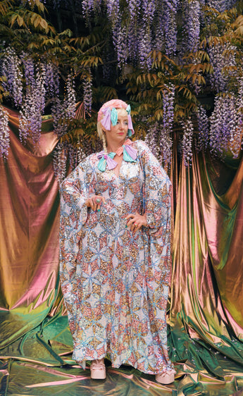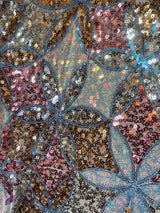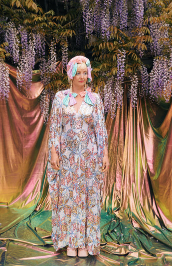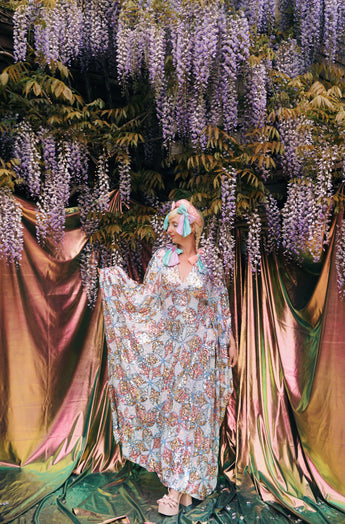 Starburst Flowers Sequin V-Neck Kaftan Gown in gold, silver and pink tones.