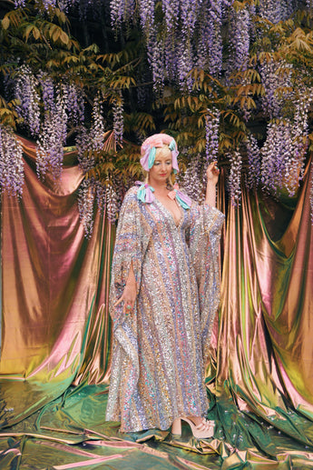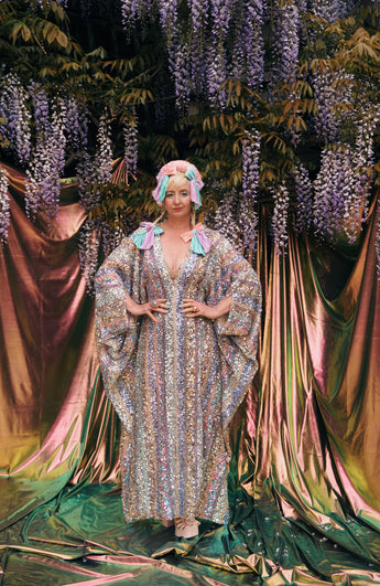Luxe pastel Rainbow Sequin Stripe V-Neck Kaftan Gown. Choose from our regular V-neck Kaftan style, Open Kimono Robe or Kimono Robe and Kaftan Combo with 60cm zipper and hidden Ribbons. This fabric is very lightweight with not much stretch on a mesh style base. Slight sheerness..