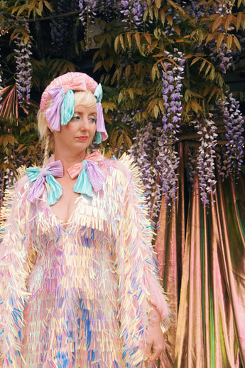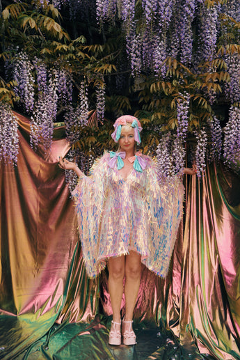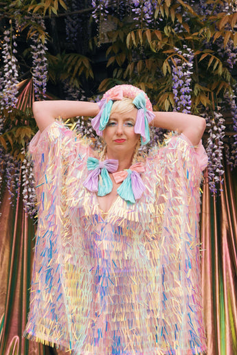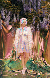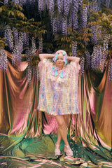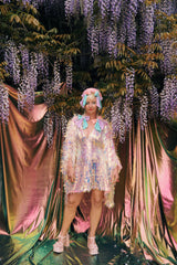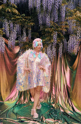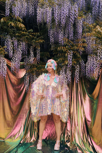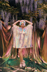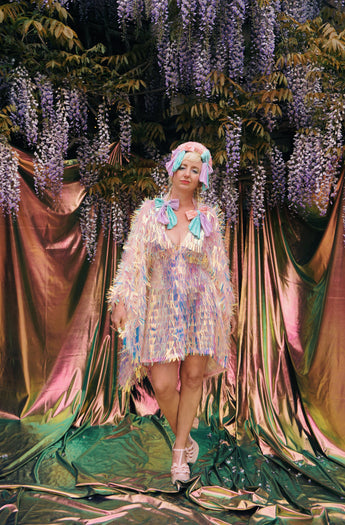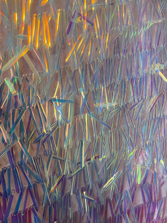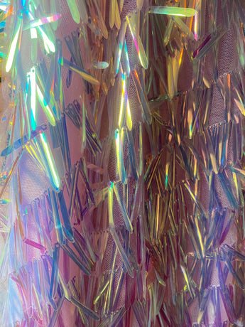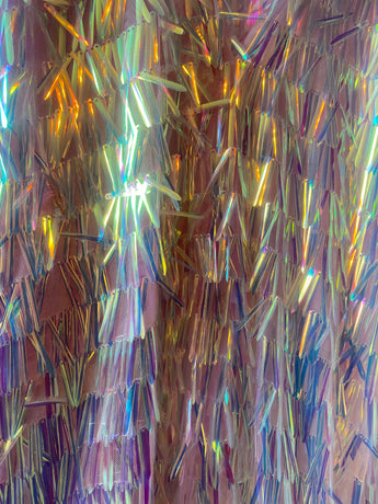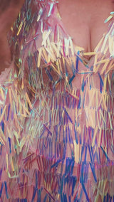 Disco Holographic Fringe Mini Dress. Layers of iridescent, holographic fringe that shimmers in rainbow hues. *Be aware the sequins are in shards and could irritate