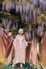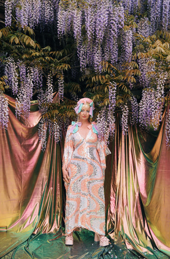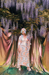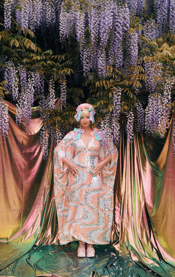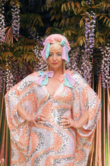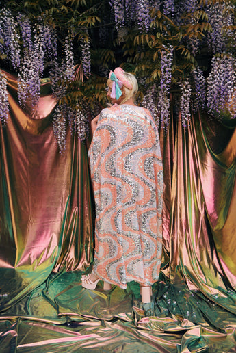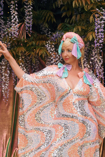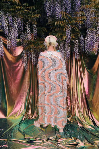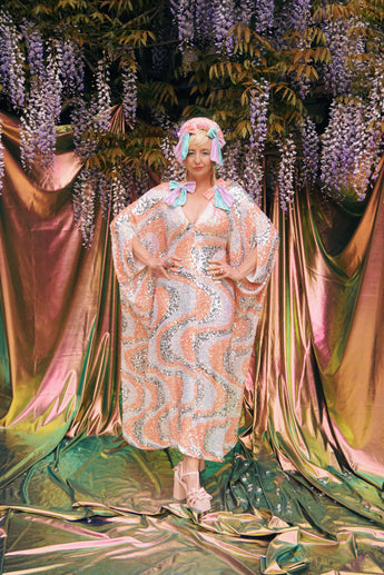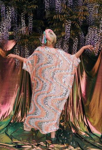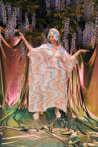 Sequin Swirl V-Neck Kaftan Gown. Kaleidoscope of coral, silver and iridescent sequins.