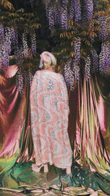 Swirl Sequin Peach and Silver V Neck Kaftan Gown, Freesize