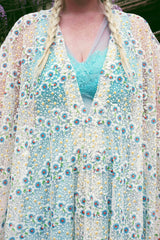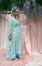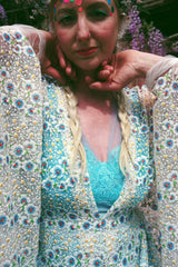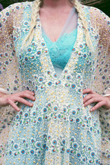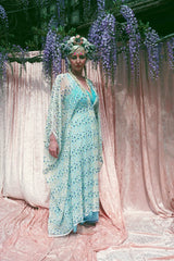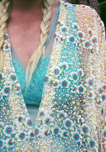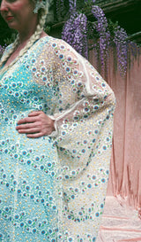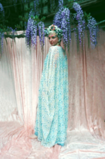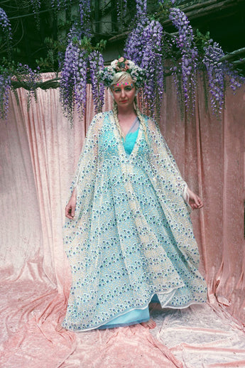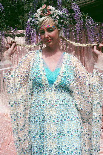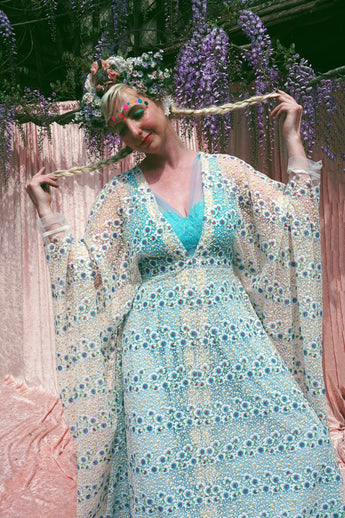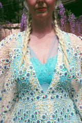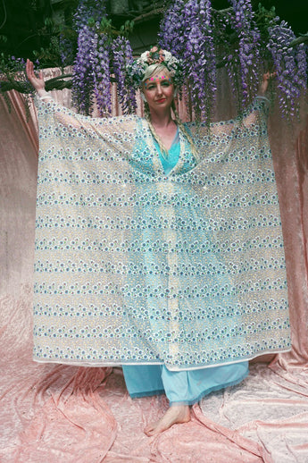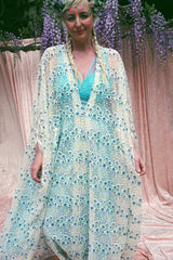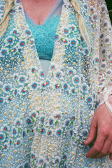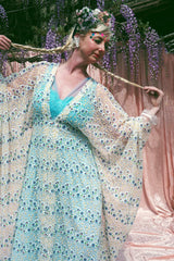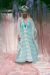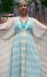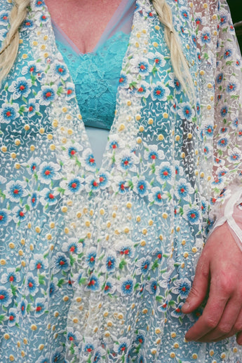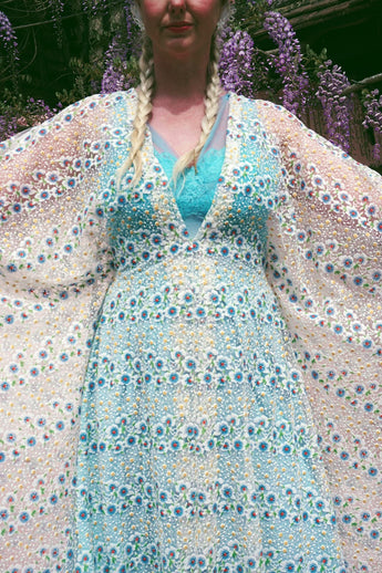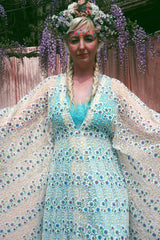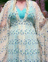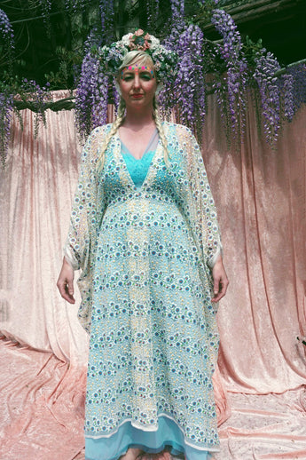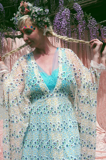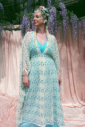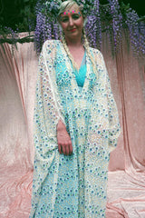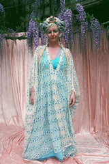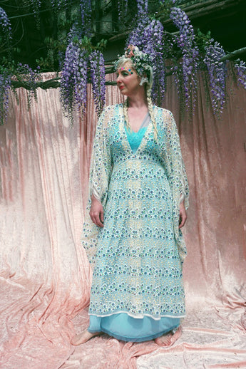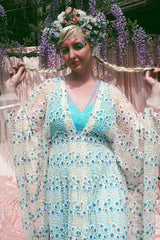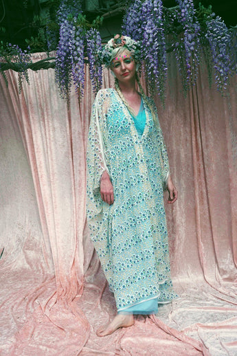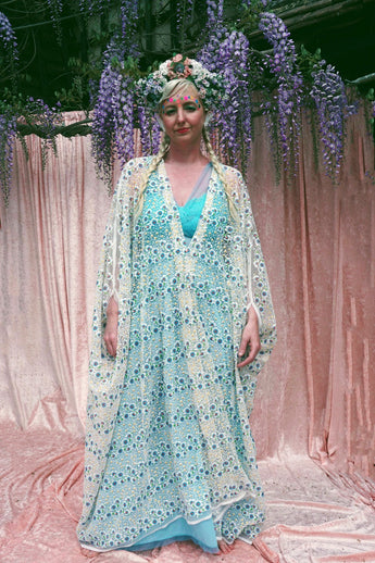 Delicate and elegant white lace fabric with floral embroidery made into a deep plunge kaftan dress and worn here with a blue vintage slip underneath (not included with the dress).