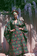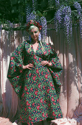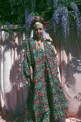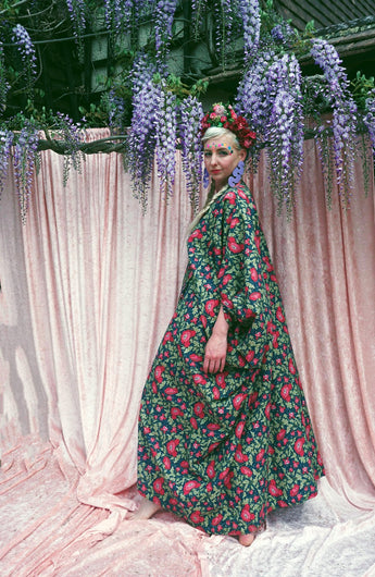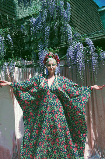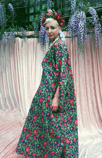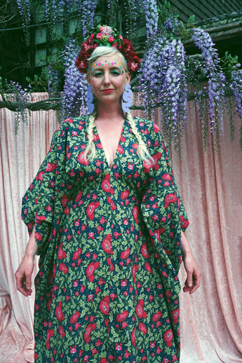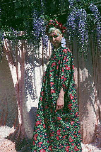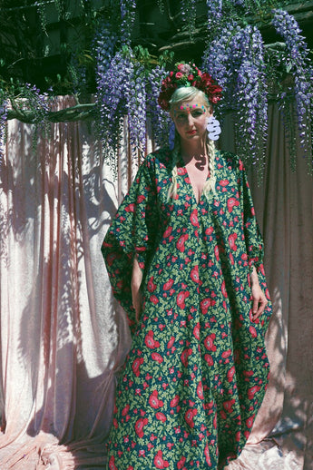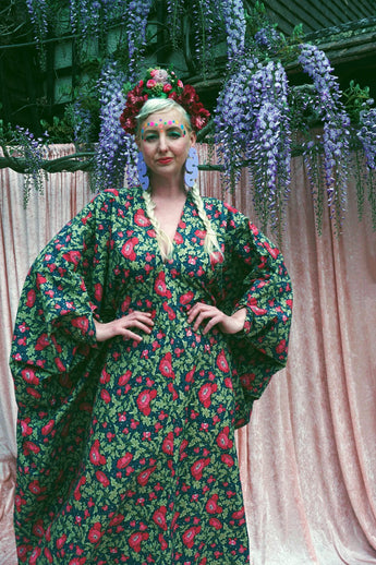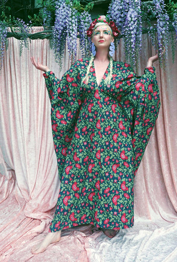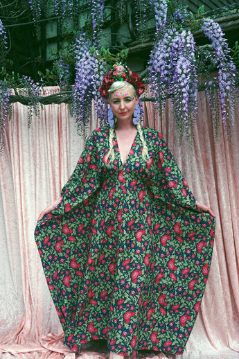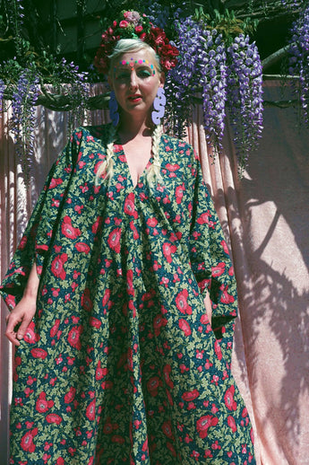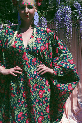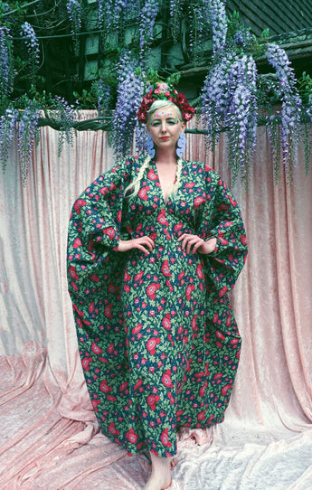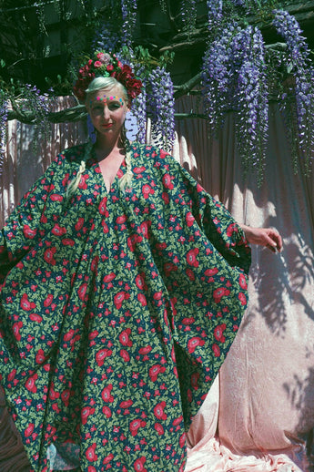 Free size UK 6-32 and the kaftan dress style is fitted with hidden velvet ribbons on the inside meaning you can wear them two ways - 1) Free, loose and baggy, and 2) with the ribbons tied at the waist to pull the dress in and frame your figure. Unlined.
