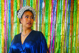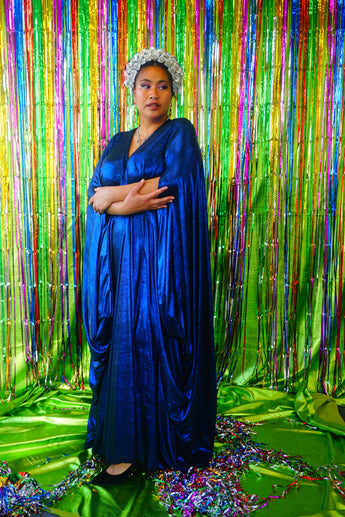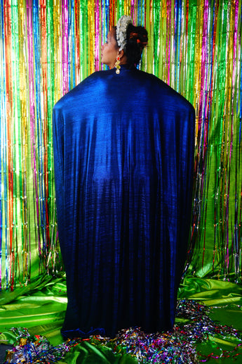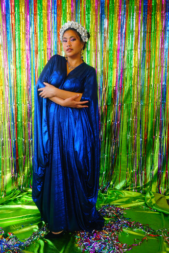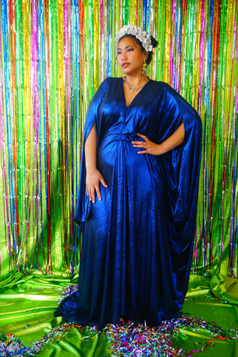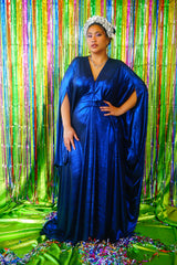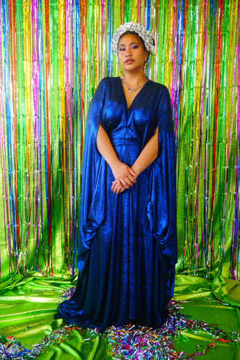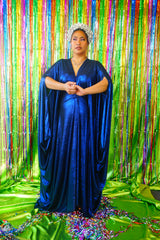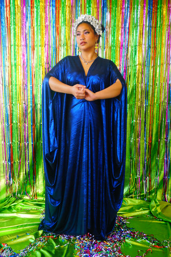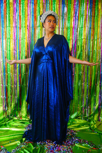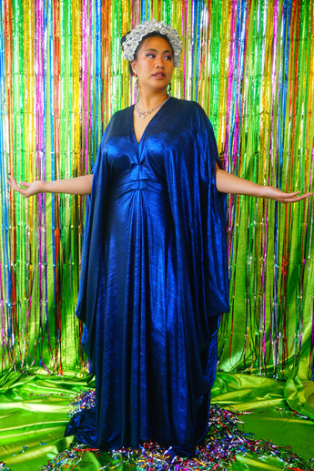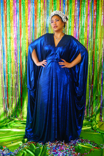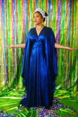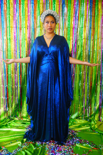 Metallic Blue Pleated Studio 54 Maxi Kaftan Dress