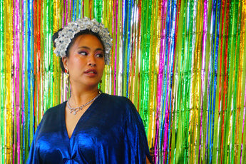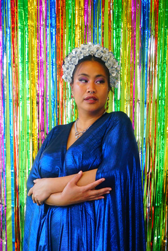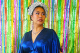 Our kaftan dresses are uniquely fitted with hidden velvet ribbons on the inside meaning you can wear them two ways - 1) Free, loose and baggy, and 2) with the ribbons tied at the waist to pull the dress in and frame your figure.