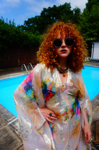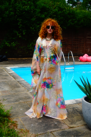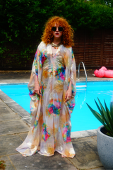 Kaftan Gown / Dress - Free size UK 6-30 (with full measurements below) Our kaftan dresses are uniquely fitted with hidden velvet ribbons on the inside meaning you can wear them two ways - 1) Free, loose and baggy, and 2) with the ribbons tied at the waist to pull the dress in and frame your figure.