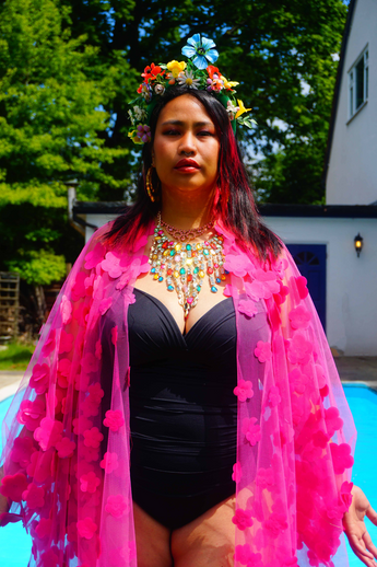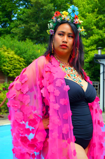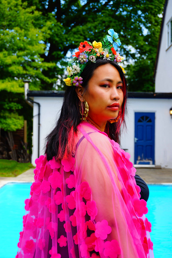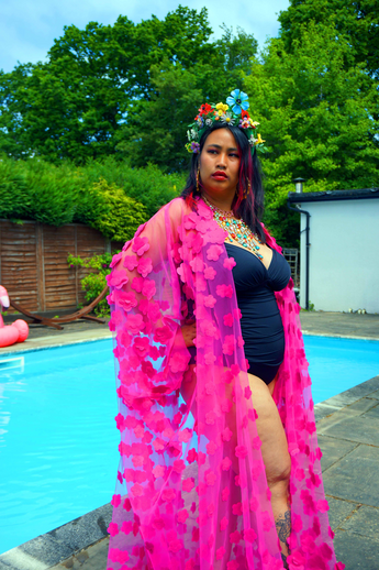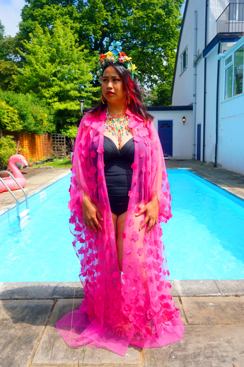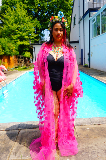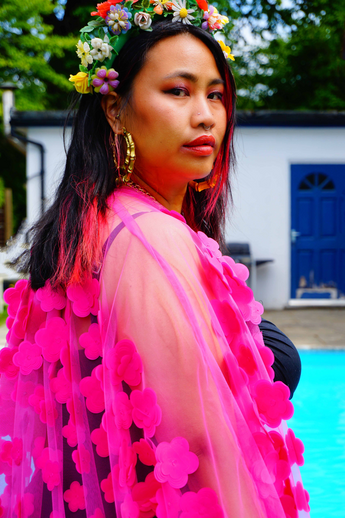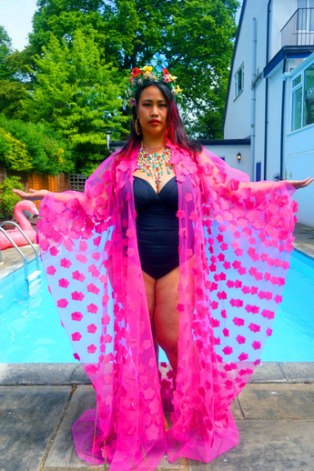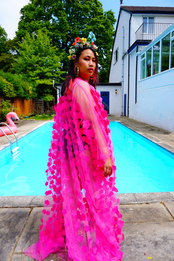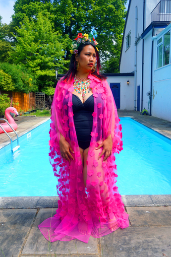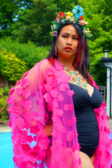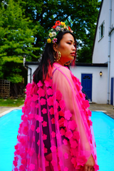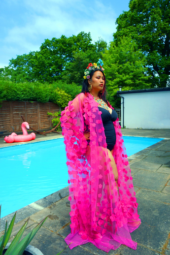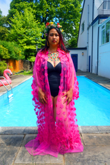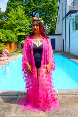 Hot pink 3D flower mesh Kaftan Gown / Kimono Robe
