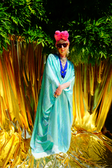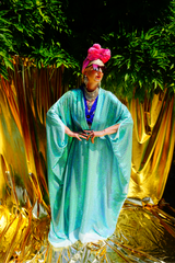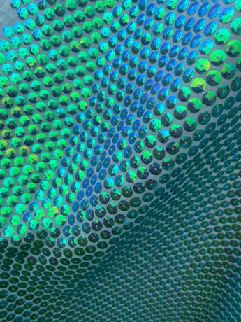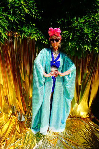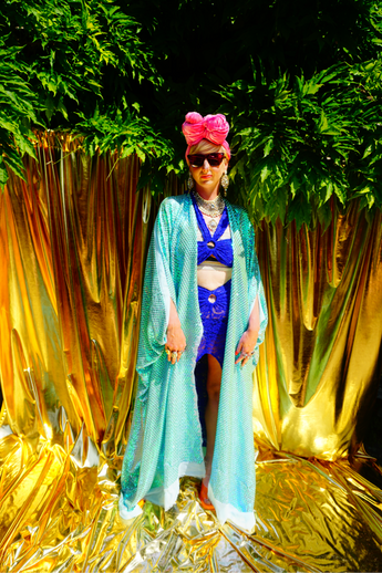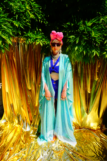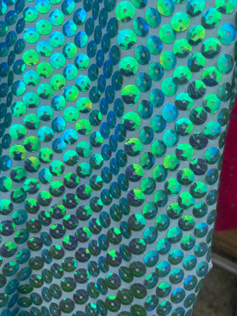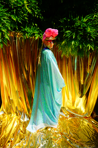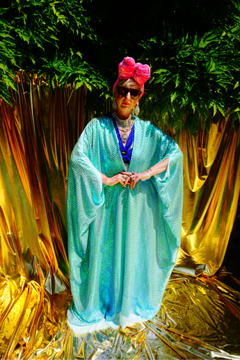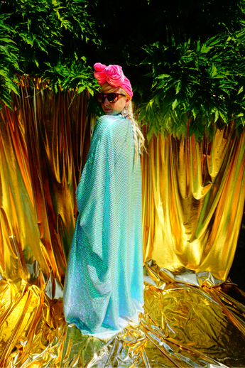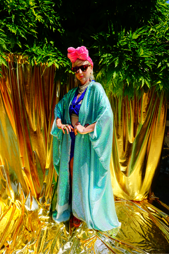 Iridescent Ice Blue Sequin Kaftan Gown / Kimono Robe on a sheer chiffon fabric base.