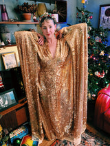 1) Gold Holographic Sequin batwing Kaftan Dress/gown. The dress has a V-neck plunge and can be worn loose and free or tied with our hidden ribbons for a more figure hugging look. No lining, comfortable to wear, with some stretch and a medium weight. FREESIZE from UK 6-26 (Normal retail Price £145) - photos 1-3