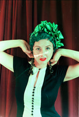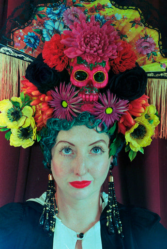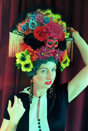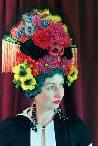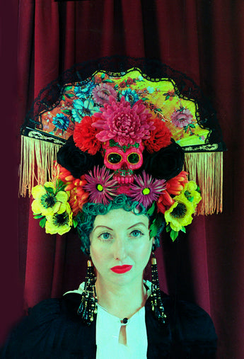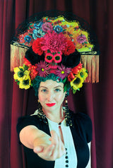 1) A mexican day of the dead headdress with pink decorated skull, array of flowers and giant tasseled fan. Elasticated to fit any head size.
