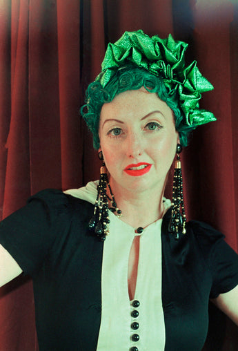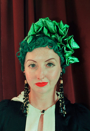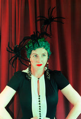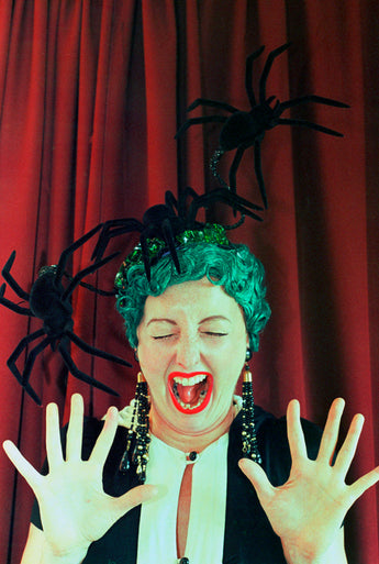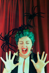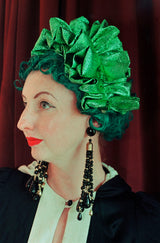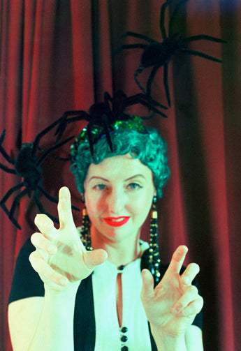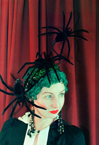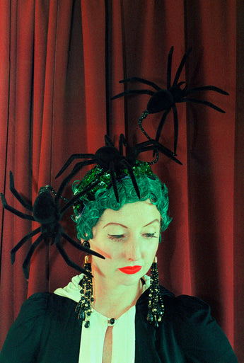 2) Giant spiders creepy crawly headpiece. 3 giant moveable spiders on a green gem encusted base. elasticated to fit any head size