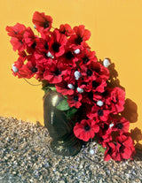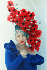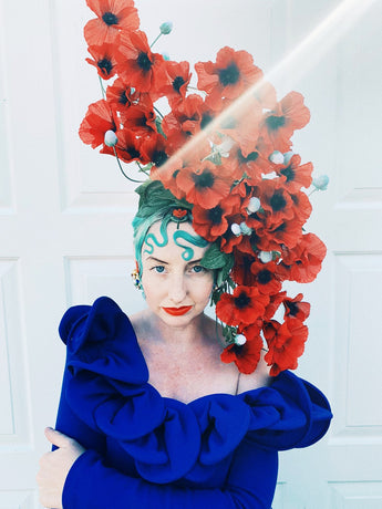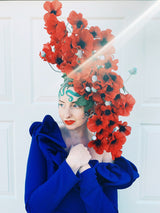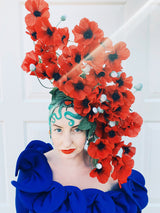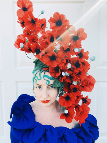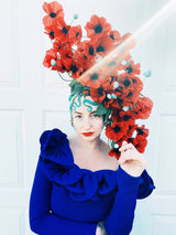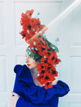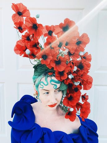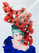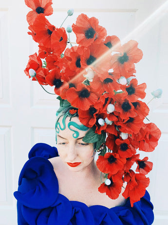 The headdress itself is made up of red poppies on bendable wire, so you can shape and mould the piece to your liking. It's attached to a stiffened felt back with elastic stretching at the nape of the neck to allow for comfort and security and to fit any headsize. It also makes a great display piece as photographed on the mannequin head.