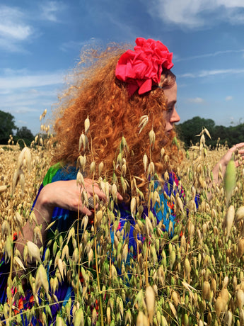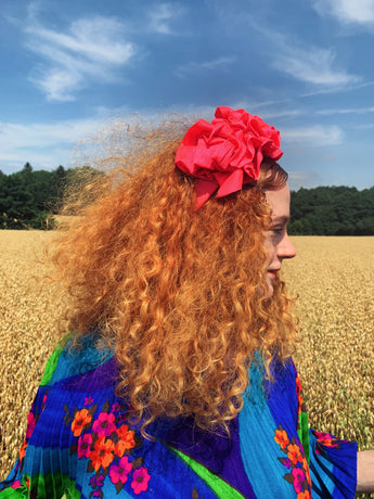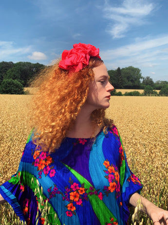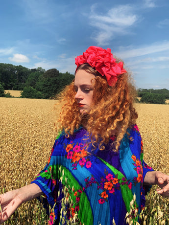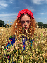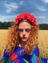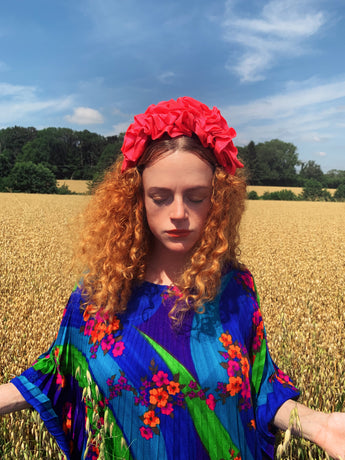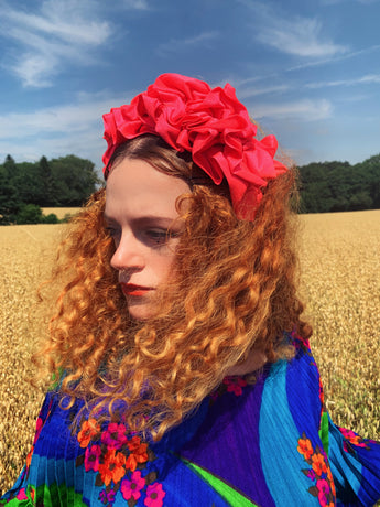 This cerise pink headband is made from a dupion silk replica fabric with a matte finish. The Side/asymmetrical design has the ruffles veering more to one side but can be worn either side of the head simply by turning the piece around. The Full design shows the ruffles sprouting from ear to ear and the headband can be worn either way round (there is no set front or back).