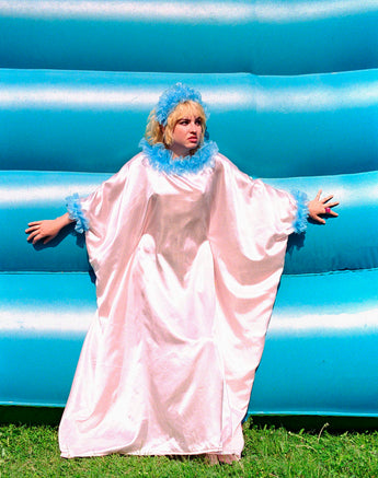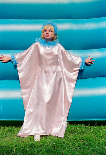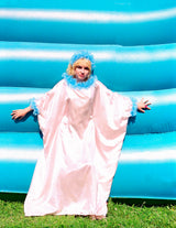 Our liquid satin kaftan dresses are lightweight, comfortable and ooze fun and sophistication at the same time. Wear with the hidden ribbons tied for a figure hugging look, or wear loose and oversized for a free and easy style. Choose your own colour of ruffles for the neck and arms from the colour list below.