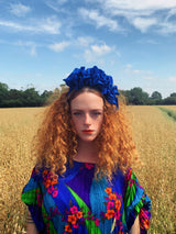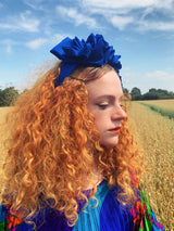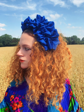 This Royal Blue headband is made from a dupion silk replica fabric with a matte finish. The Side/asymmetrical design has the ruffles veering more to one side but can be worn either side of the head simply by turning the piece around. The Full design shows the ruffles sprouting from ear to ear and the headband can be worn either way round (there is no set front or back).