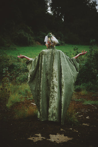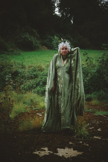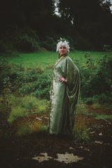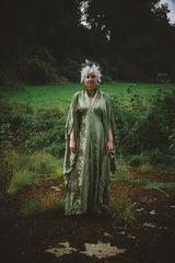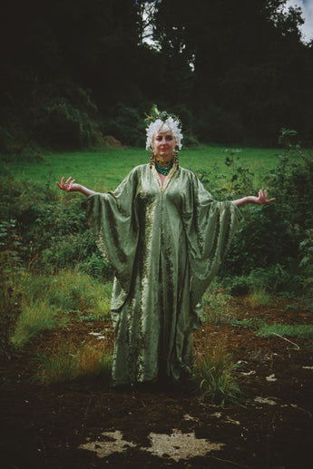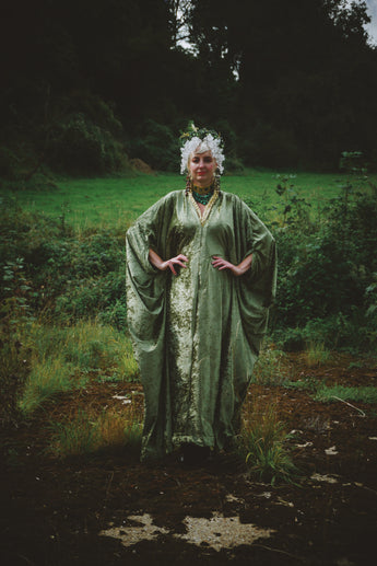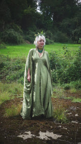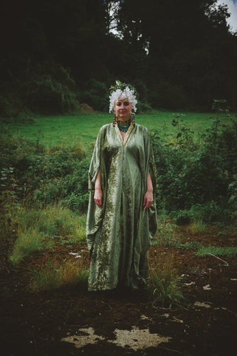 Effortless Velvet Olive Green Kaftan Gown. A lightweight Crushed Velvet in our standard V-neck style.