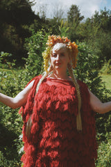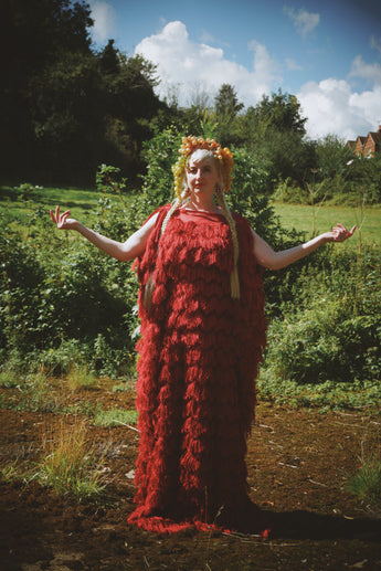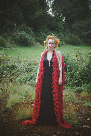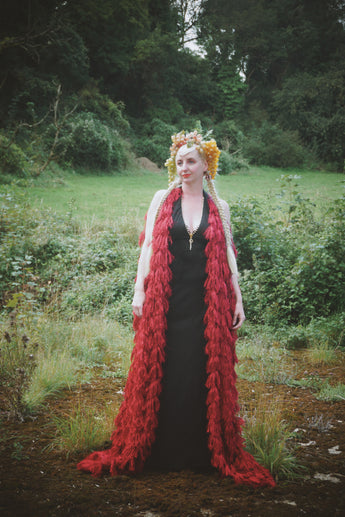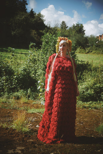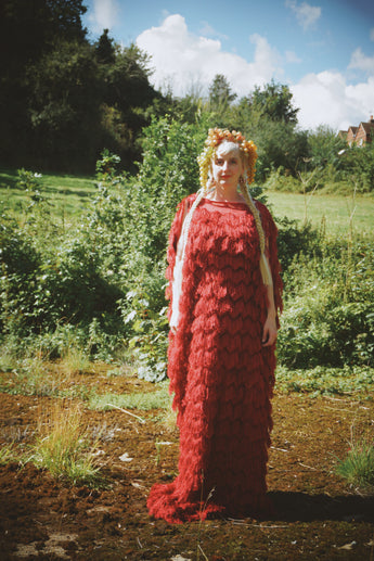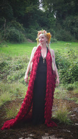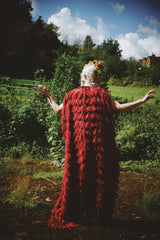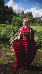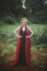 Fuzzy eyelash in Crimson Red, Slash Neck, Kaftan Gown.