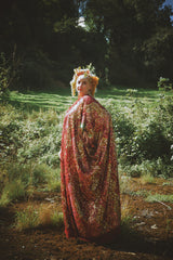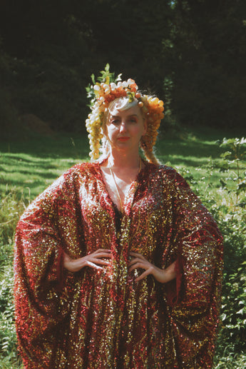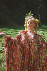 Fuzzy Eyelash Sequin Reds, golds Iridescent wave pattern kaftan Gown