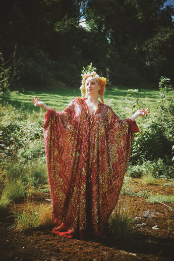 This kaftan gown features a stunning red and gold colour scheme, adorned with fuzzy eyelash sequins for a dazzling iridescent wave pattern.