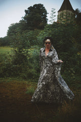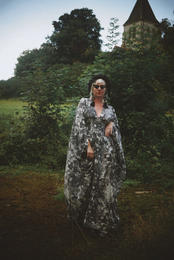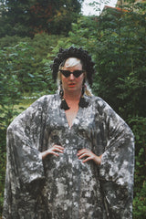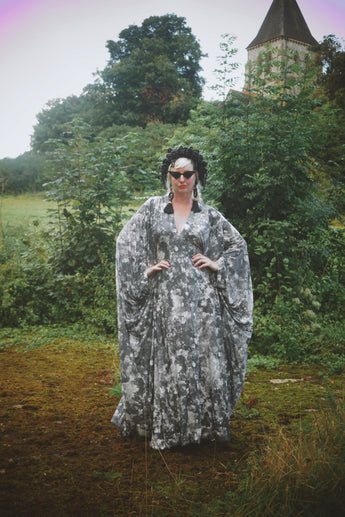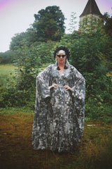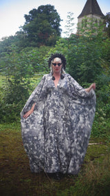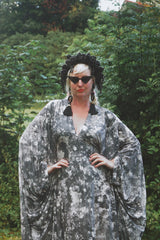 Grey sequin disc print Jersey V-neck Kaftan Gown. A soft jersey fabric in an Grey sequin disc print