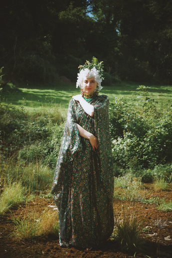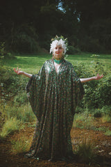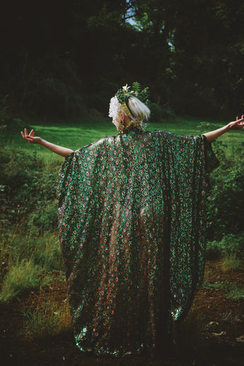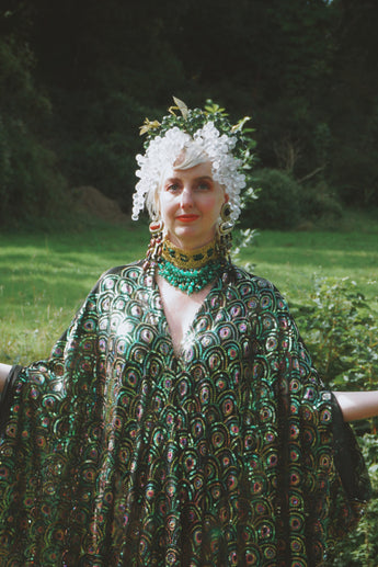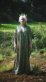Peacock Sequin Green patterned and Iridescent kaftan Gown on a black mesh base - semi sheer super sparkly