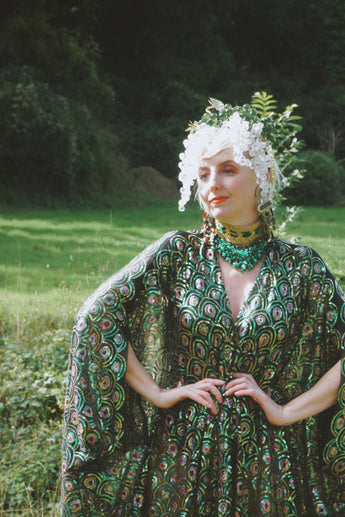 Peacock sequin Green patterned and Iridescent kaftan Gown
