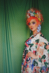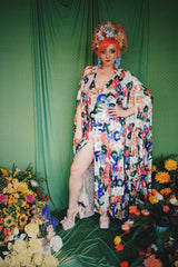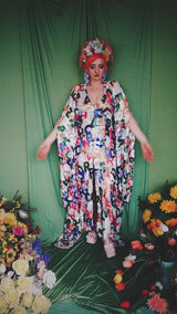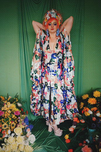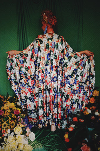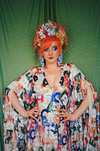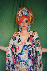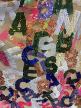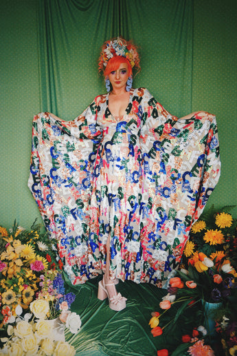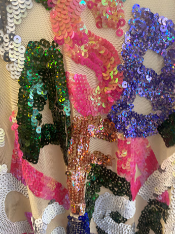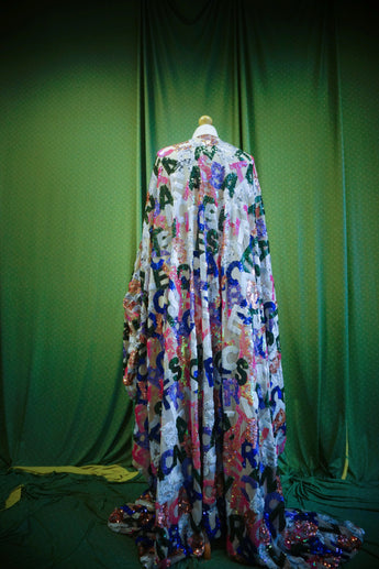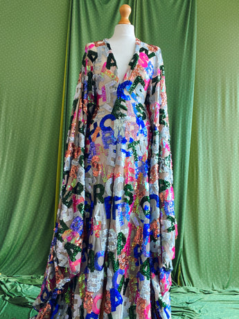 The ultimate showstopper of a dress. Sequinned letters of the alphabet in a random arrangement in colours of iridescent pink , holographic lilac, blues and greens, flip silver and white with a Deep plunge neckline and high front split and extra long draping sleeves. DRAMA.