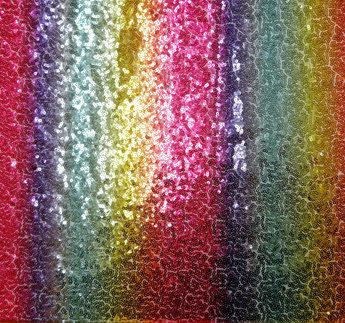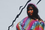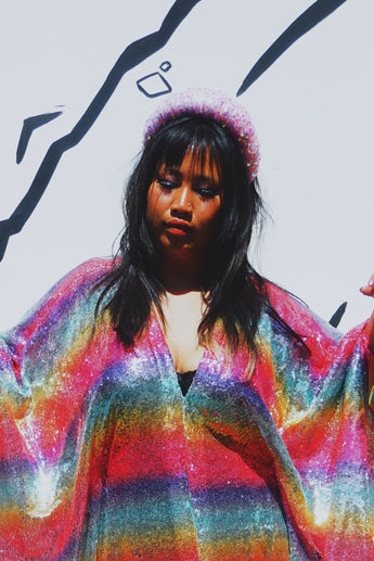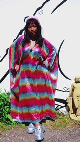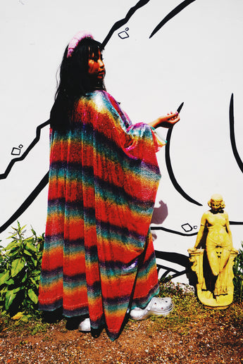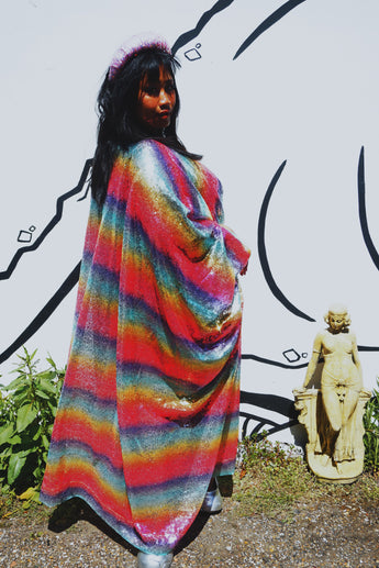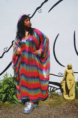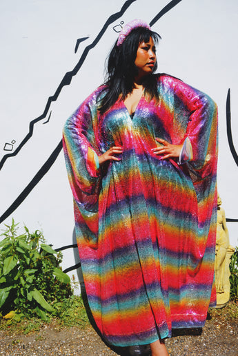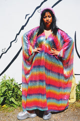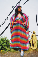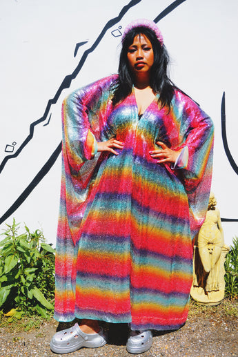 Rainbow Bright Striped Sequinned V-Neck Kaftan Gown on a mesh base with some stretch and semi sheer. Very Lightweight. Worn with our hidden ribbons tied to cinch in at the waist (can also be worn loose).