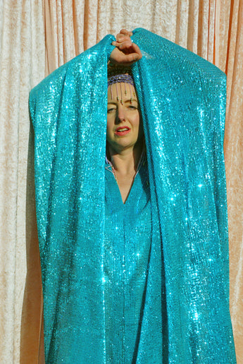 Beautiful blue small sequins on a stretch pleated mesh base. Slightly sheer - worn here with a white slip underneath.