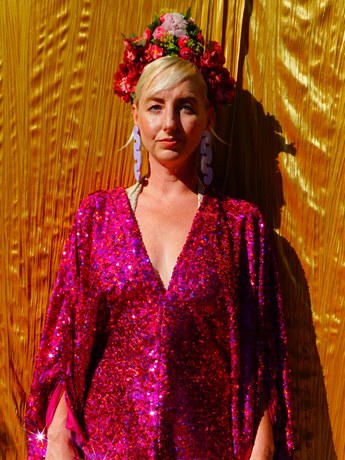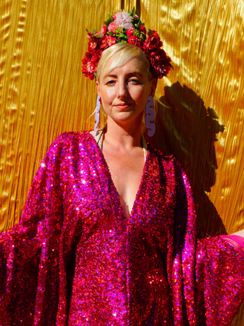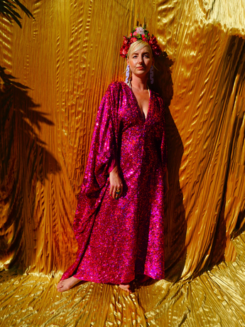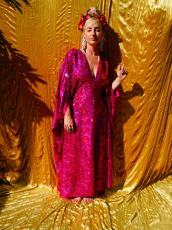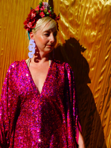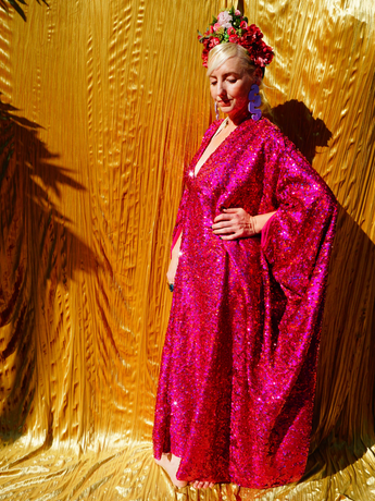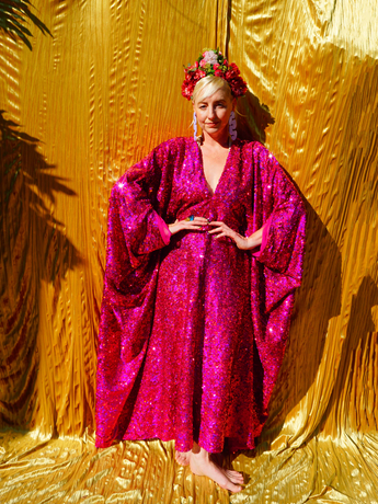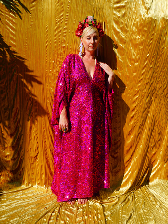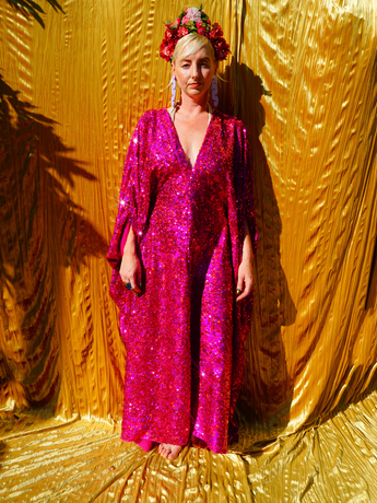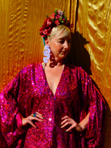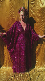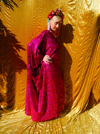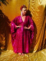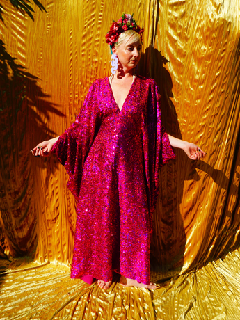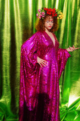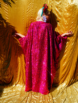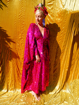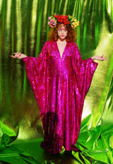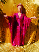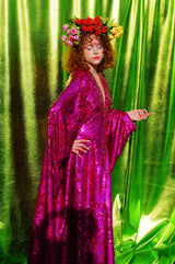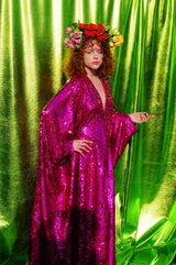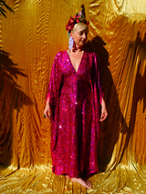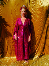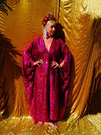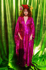 Cerise Pink Holographic Sequin Maxi Kaftan Gown or Kimono Robe. These sequins are a heavy weight on a mesh base with some stretch. The style pictured is a V-neck plunge - we can also make in our slash neck style (see here) if you wish for this style please add it to your order notes when checking out.