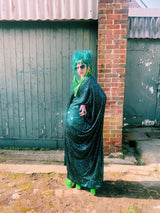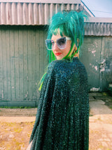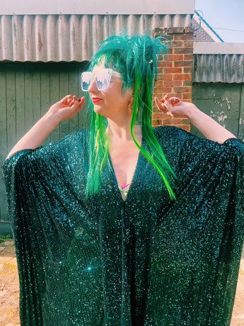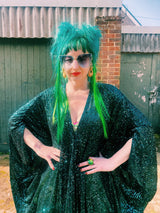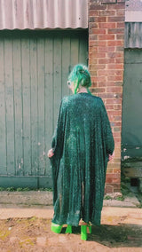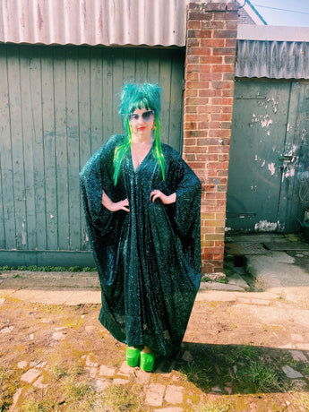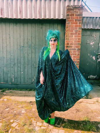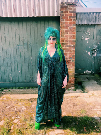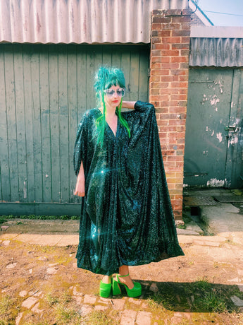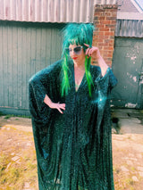 Deep Teal Sequinned knit V-Neck Kaftan Gown with stretch and a slight sheerness. Lightweight. Worn with our hidden ribbons tied to cinch in at the waist (can also be worn loose).