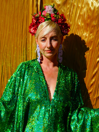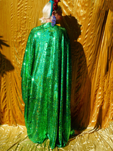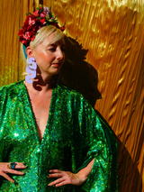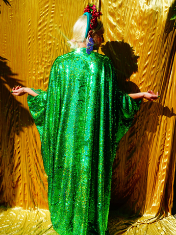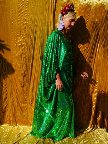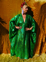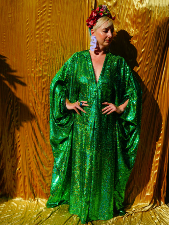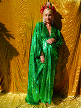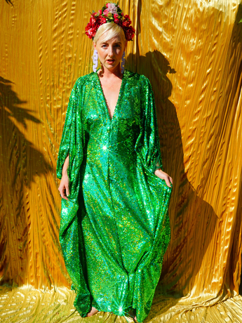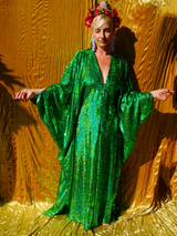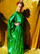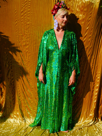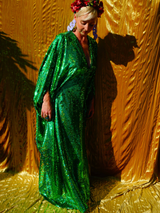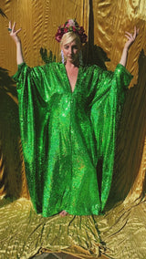 Emerald Green Holographic Sequin Maxi Kaftan Gown or Kimono Robe. These sequins are a med-heavy weight on a mesh base with some stretch. The style pictured is a V-neck plunge - we can also make in our slash neck style (see here) if you wish for this style please add it to your order notes when checking out.