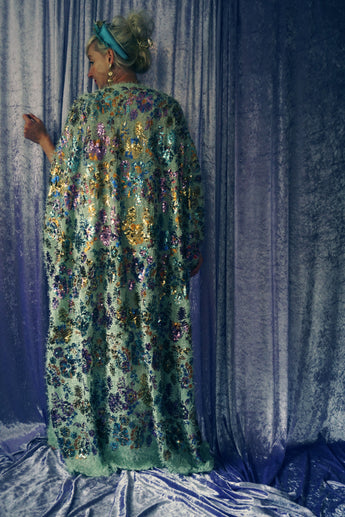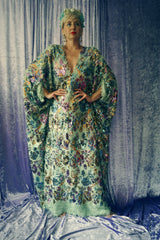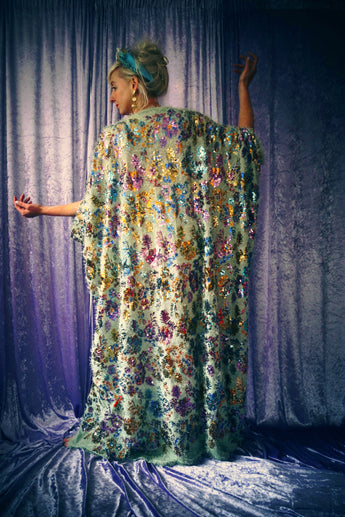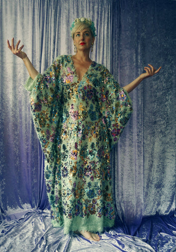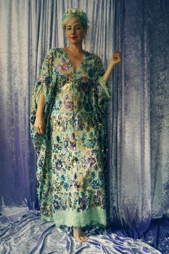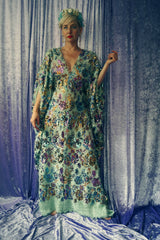 Our kaftan dresses are uniquely fitted with hidden velvet ribbons on the inside meaning you can wear them two ways - 1) Free, loose and baggy, and 2) with the ribbons tied at the waist to pull the dress in and frame your figure.