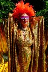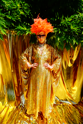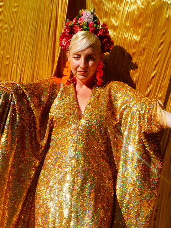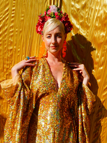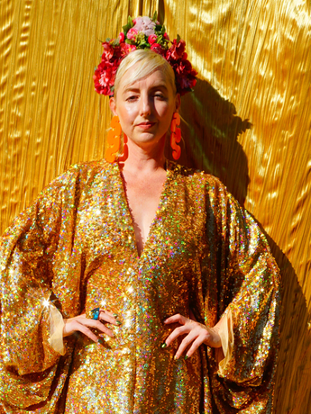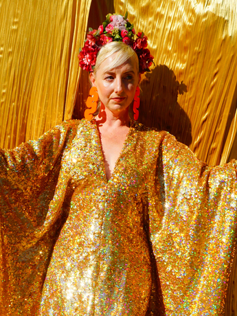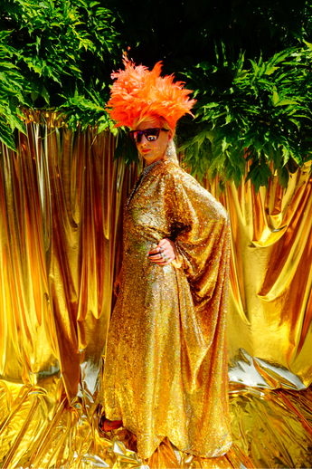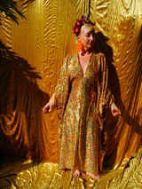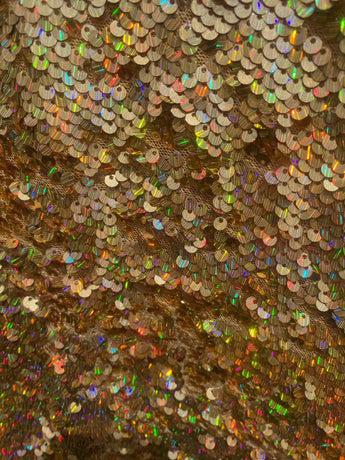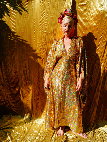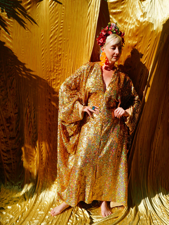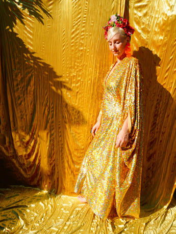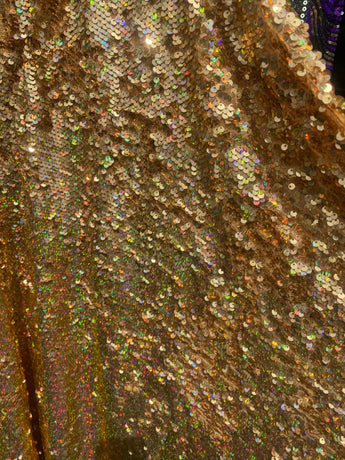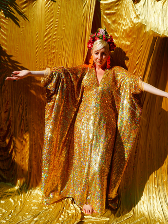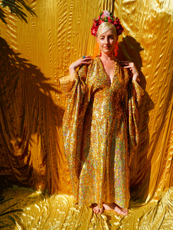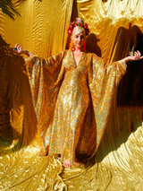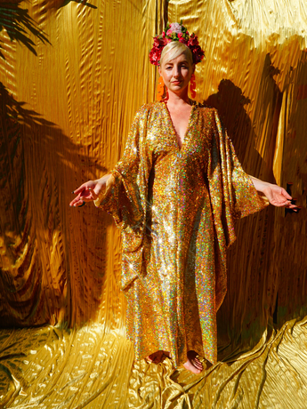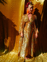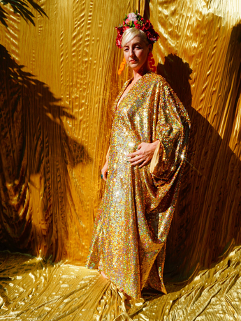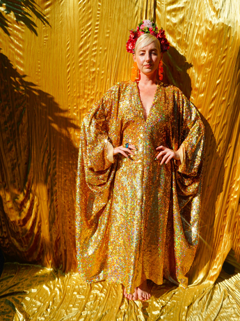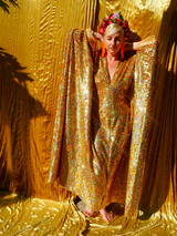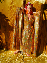 Gold Holographic Sequin Maxi Kaftan Gown or Kimono Robe. These sequins are a heavy weight on a mesh base with some stretch. The style pictured is a V-neck plunge - we can also make in our slash neck style (see here) if you wish for this style please add it to your order notes when checking out.